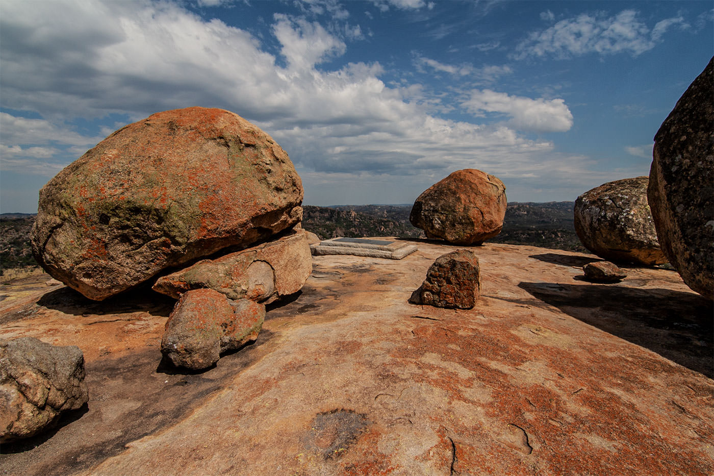 Unser nächstes Ziel ist der Matobo-Nationalpark. Dazu geht es zunächst etwa 250 km nach Südwesten, bis wir Bulawayo erreichen, die zweitgrößte und älteste Stadt Simbabwes. Bulawayo liegt bereits im Matabele-Land, die Bevölkerung ist hier nicht mehr Shona, sondern Ndebele, ein Umstand, dem wir allerdings keine größere Bedeutung beimessen und der nur der Vollständigkeit halber erwähnt wird. In Bulawayo wird getankt und nach dem Weg gefragt, 35 km später stehen wir am Tor des Nationalparks und entrichten die notwendigen Gebühren. Das erste Ziel sind Höhlenmalereien, allerdings steht vor der Höhle ein Schild mit dem Hinweis: „Bitte verlassen Sie Ihr Auto nicht!“ ??? Also versuchen wir durch die staubigen Scheiben einen Blick auf irgendetwas zu werfen, was nach Höhlenmalereien ausschaut – Fehlanzeige. Einige Kilometer geht es durch eine interessante Landschaft mit sogenannten ‚balancing rocks‘, dabei handelt es sich um große Felsen, die aufeinander stehen und… balancieren. Diese Felsformationen entstanden durch Jahrmillionen andauernde Erosion und sind in gewisser Weise einmalig in der Welt, in jedem Fall aber typisch für Simbabwe. Bald erreichen wir einen Granithügel, von dessen Spitze man einen herrlichen Ausblick auf die Umgebung hat und der nebenbei die letzte Ruhestätte des Sir Cecil Rhodes ist, des Gründers und Namensgebers Rhodesiens, eines Menschen, der sich in Simbabwe nicht nur Freunde geschaffen hat. Egal, das ist Geschichte und ich klettere hinan, während Sabine am Fuße des Hügels verharrt und mit dem Kartenverkäufer flirtet. Eigentlich wollen wir in Matobo übernachten und der Campingplatz ist gar nicht so übel. Als jedoch eine gierige Pavian-Herde den Platz einzunehmen droht und von keiner Seite Abhilfe geschaffen wird, suchen wir lieber das Weite. Paviane – besonders hungrige – können wirklich lästig werden.
