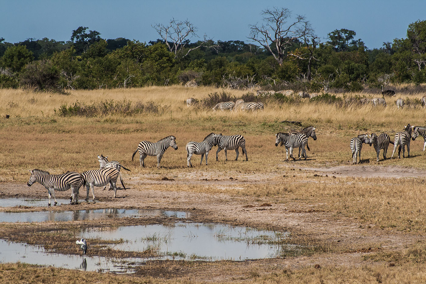 Wir gehen aber aufs Ganze, die nächste Beobachtungsplattform des Wildparks ist nur 11 Kilometer entfernt, 11 hin, 11 zurück, plus 80 nach Hwange-Stadt, das müsste klappen. Also rein in den Park und nach 500 Metern schon die erste Attraktion, eine Giraffe, wenig später eine Landschildkröte und ein paar Vögel, besonders die Nashornvögel haben es uns angetan. Der Weg durch den Park war mal geteert, hat aber seine beste Zeit lange hinter sich, Loch reiht sich an Loch und oft genug weicht man in den Busch aus, man hat auch gegenüber den Achsen seines Vehikels eine Verantwortung. Dort ist ein Schildchen, der Abzweig zur Plattform. Noch ein paar Kilometer geht es über eine Sandpiste, der Wagen schlingert lustig hin und her lustig. Dann ist der Beobachtungsposten erreicht, aus luftiger Höhe können wir eine Wasserstelle ausmachen, an der sich bereits einige Tiere erquicken. Zwei Zebragruppen, eine Handvoll Strauße, Impalas und rothalsige Hornbills, die wir anfangs irrtümlicherweise für Geier halten. Ein Königreich für ein Fernglas (und bessere Fauna-Kenntnisse). Stundenlang sitzen wir hier und lassen die ganze Szenerie auf uns einwirken. Ab und an erheben sich aus den Fluten der Wasserstelle die Köpfe von drei oder vier Flusspferden, ein Krokodil erscheint für einen Moment auf der Bühne, um einen Fisch zu verspeisen und wir werden von kleinen blauen Vögeln mit orangefarbenen Augen (gehören zur Familie der Stare) aufmerksam beobachtet, ob wir nicht etwas Essbares mitgebracht haben und davon unter Umständen etwas fallen lassen. Es geschieht nichts Spektakuläres, kein Löwe erscheint auf der Bildfläche und reißt nach atemberaubendem Kampfe einem Zebra den Kopf ab, aber das ist egal. Es ist einfach angenehm zu sitzen und zu schauen, die Ruhe des Busches, kein Mensch weit und breit, kein Auto, kein Internetcafé… Auf der Plattform bereiten wir uns auf dem Gaskocher unser Mittagessen und die Stare kommen noch näher. Doch bald müssen wir fahren, wir haben noch ein paar Kilometer bis Hwange und schließlich brauchen wir Benzin. Die Wahrscheinlichkeit abends welches zu bekommen, ist gering, die Tankstellen werden so oder so geschlossen sein.