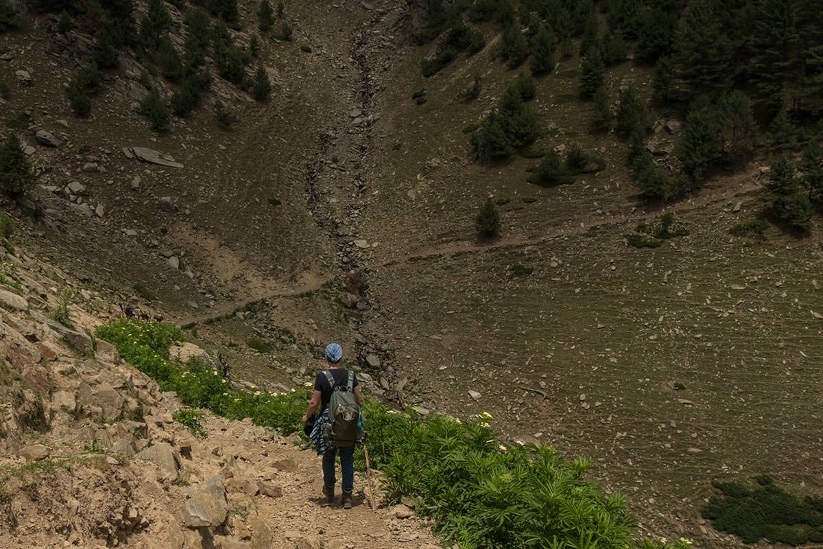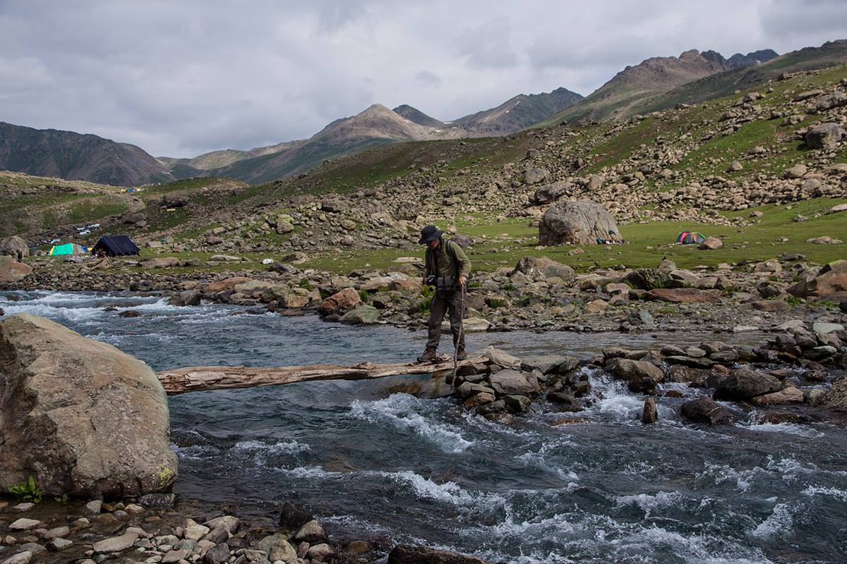 Von den Weiden Trunkhols bis zum Gangabal-See sind es – je nach Tempo – zwischen zwei und vier Stunden (wir sehen unsere Begleiter nur von hinten, obgleich sie nach uns starteten, hm, etwas unlogisch, aber Tatsache). Zwei längere Anstiege sind zu bewältigen, kurz vor dem Nandakol-See (einer der beiden „Zwillings-Seen“, der zweite ist der Gangabal) ist ein Gebirgsfluss zu überqueren, die Brücke besteht aus zwei alten wackeligen Baumstämmen. Am Nandakol campieren auch die meisten Wanderer (insbesondere die Gruppen-Reisenden), wir treffen eine zwanzigköpfige Mannschaft aus Taiwan, die sogar ein Klo- und Duschzelt dabei haben. Wohl dem…