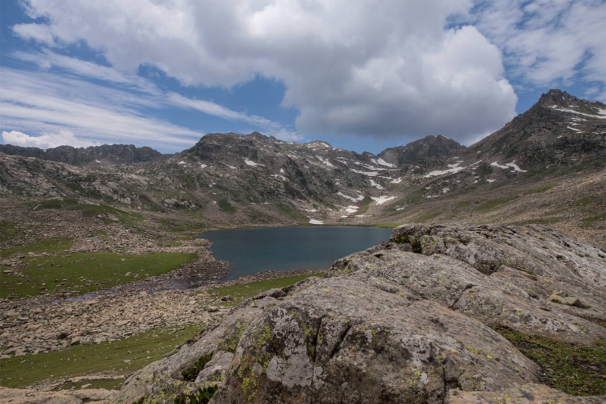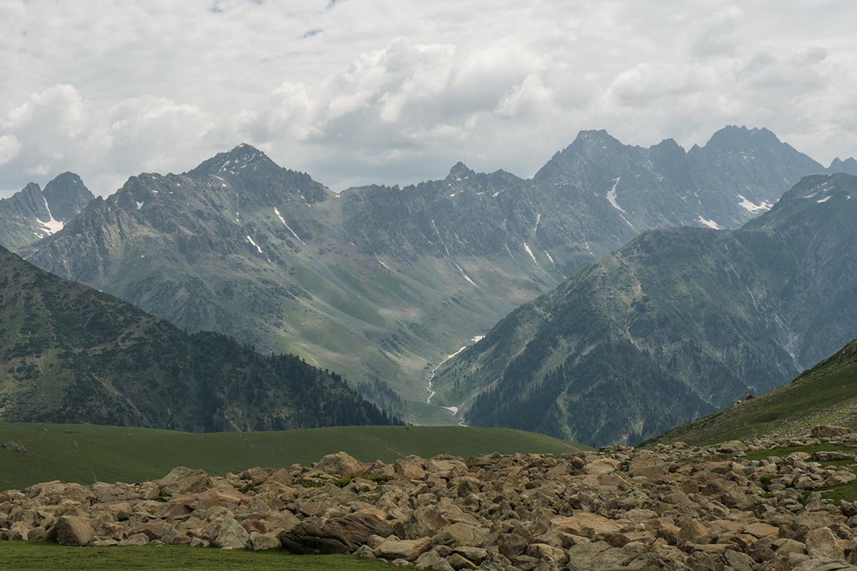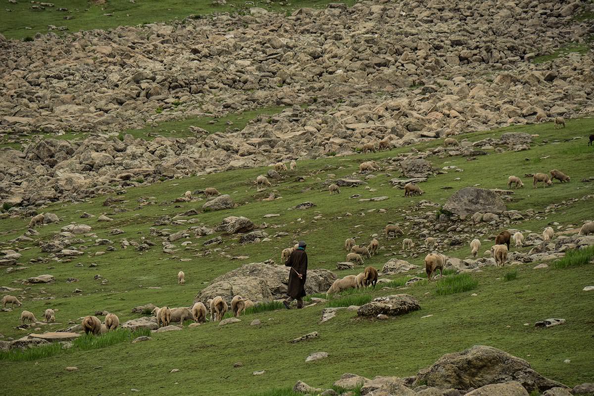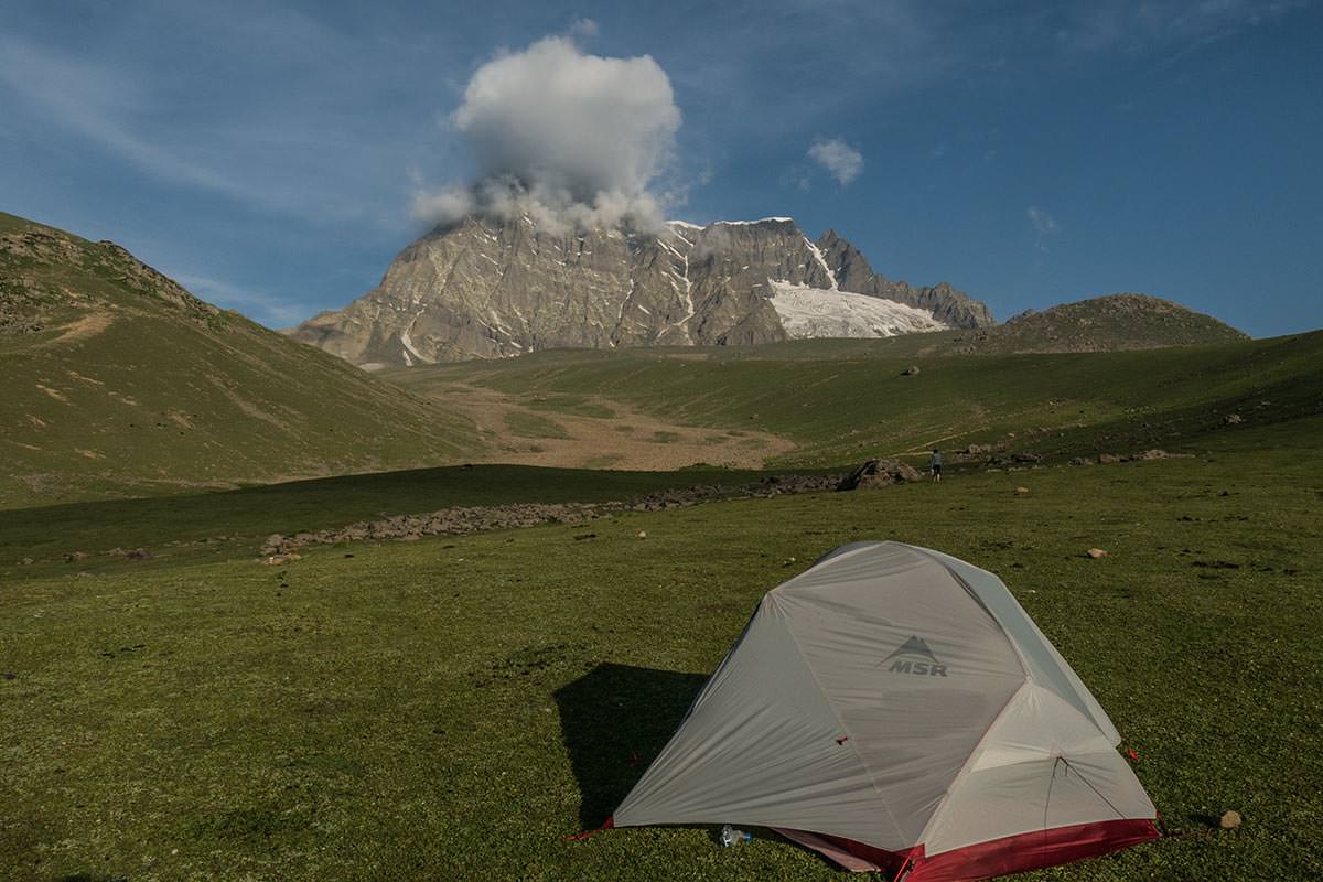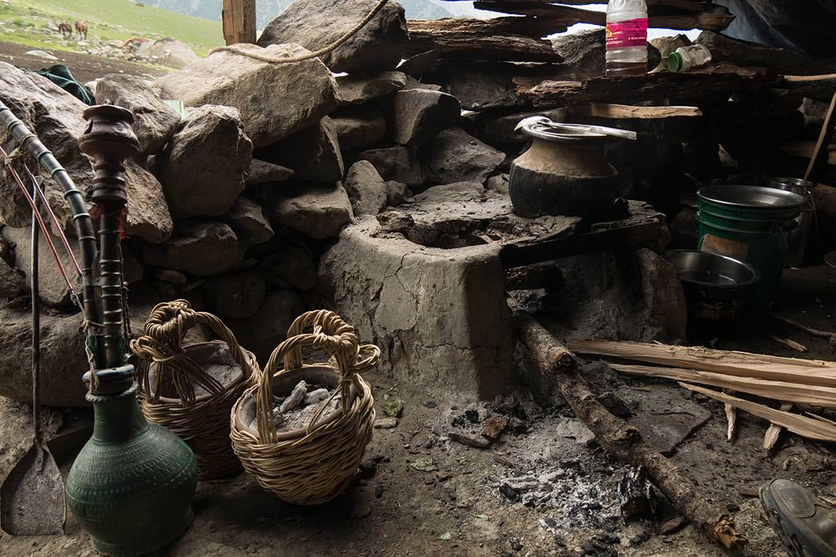 Das Camp ist – wie erwähnt – auf einer großen Weide, Yaks, Schafe, Pferde und die Hirten beschnuppern schon am frühen Morgen neugierig unsere Unterkunft und angesichts dieser Exponiertheit fragen wir uns, wie und wo wir unsere Notdürfte verrichten werden. Gut, dass auf der Wiese der eine oder andere größere Felsblock herumliegt. Heute (schon) ist Ruhetag, naja, annähernd. Unser Guide schlägt jedenfalls einen solchen vor. Damit wir aber in Übung bleiben, wandern wir Richtung Mt. Haramukh und dann links zum Kolsar-See; von hier aus hat man einen guten Blick auf Trunkhol und die Berge in der Kulisse. Unterwegs machen wir an einer Hirtenunterkunft halt und bekommen einen frisch gebrühten Yakbutter-Tee, knorriges Fladenbrot und die Gelegenheit, in so ein Nomaden-Heim hineinzuschauen. Bequem und gemütlich ist etwas anderes, Hirten sind dann wohl eher pragmatisch, ein Fernsehsessel oder eine Stereoanlage wirkte hier deplatziert und wäre wohl auch unpraktisch. Wir verabschieden uns von unseren Gastgebern (mit einem Geldgeschenk…), machen am Kolsar-See ein paar Blümchen-Fotos und lassen uns bergab nach Trunkhol fallen.