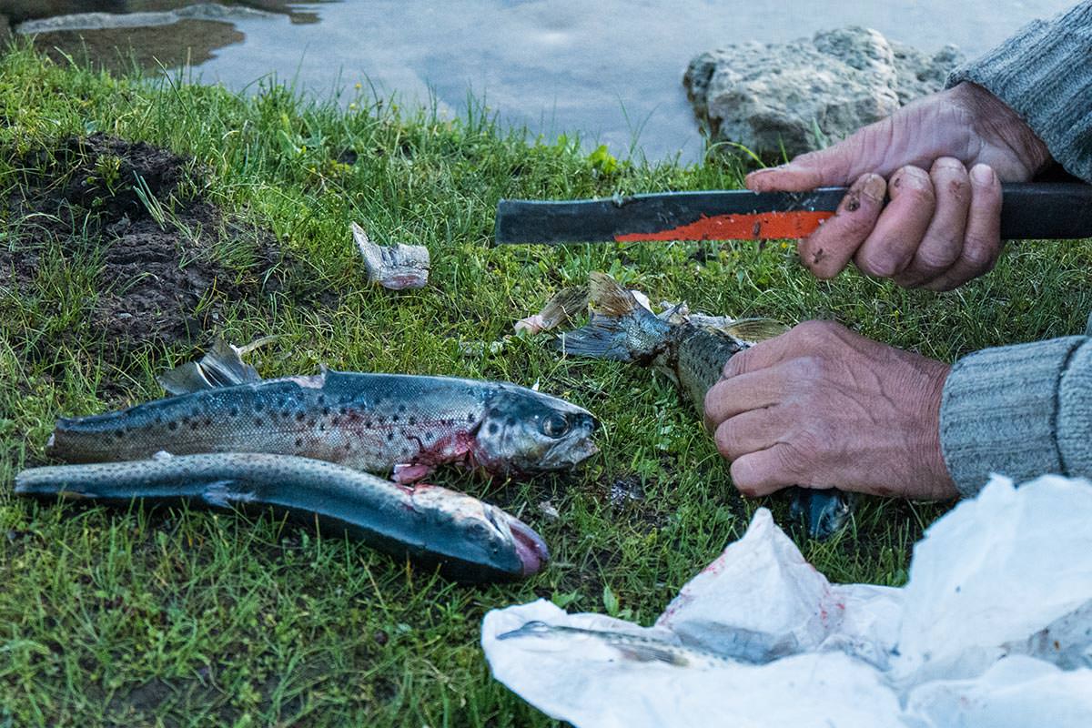 Der See ist …kalt, von türkiser Farbe und der Mt. Haramukh spiegelt sich mit seinem Gletscherüberhang in den Wassern des Sees. Vom Nandakol ein letzter Anstieg, und man hat eine herrliche Sicht auf den Gangabal-See und die ihn umgebenden Berge. Wir suchen einen Platz zum Campen, was nicht so einfach ist, da die Ufer feucht und die Anglerglück am Gangabal-SeeHänge geröllig sind und zwischenzeitlich habe ich (Frank) mir einen gehörigen Sonnenbrand an den Waden und Schienbeinen geholt (ich weiß, Anfängerfehler), der mich an diesem Tag etwas aus der Bahn wirft und wenig Lust auf irgendwelche weiteren Aktivitäten am heutigen Tag (und den nächsten Wochen und Monaten) macht. Unser Koch zaubert ein treffliches Mal aus angelaufenen Töpfen und auf rauchigem Kerosin-Brenner und wir bereden kurz die Lage. Nun ist es klar, wir werden Sonamarg (zu Fuß) nie erreichen, wir hätten heute wenigstens am nächsten planmäßigen Camp in Satsar (12 Kilometer von Gangabal, dazwischen ein Pass von über 4000 Meter Höhe) ankommen müssen, um annähernd im Limit zu bleiben. Unschaffbar! Der Guide schlägt vor, an das westliche Ufer des Sees zu wandern, dann gäbe es noch einen mehrstündigen Anstieg in die Berge und mit etwas Glück (abhängig vom Wetter) könnten wir die Spitze des K2 sehen. Mit etwas Glück. Wir versuchen dann lieber unser Glück beim Wettangeln mit unseren Begleitern, der Gangabal ist voller Forellen und es ist fast schon ein Unding, keinen Fisch zu fangen. Gemeinsam nehmen wir unseren Fang aus, der von A. köstlich zubereitet wird. Waren wir anfangs etwas enttäuscht, dass wir unser Ziel nicht erreichen werden, so ist es jetzt egal. Das Essen schmeckt und zwischenzeitlich ziehen bedrohlich dicke Wolken auf, die sich im Laufe des Abends im Verein mit einem heftigen Gewitter entleeren und uns fast in den See spülen.
