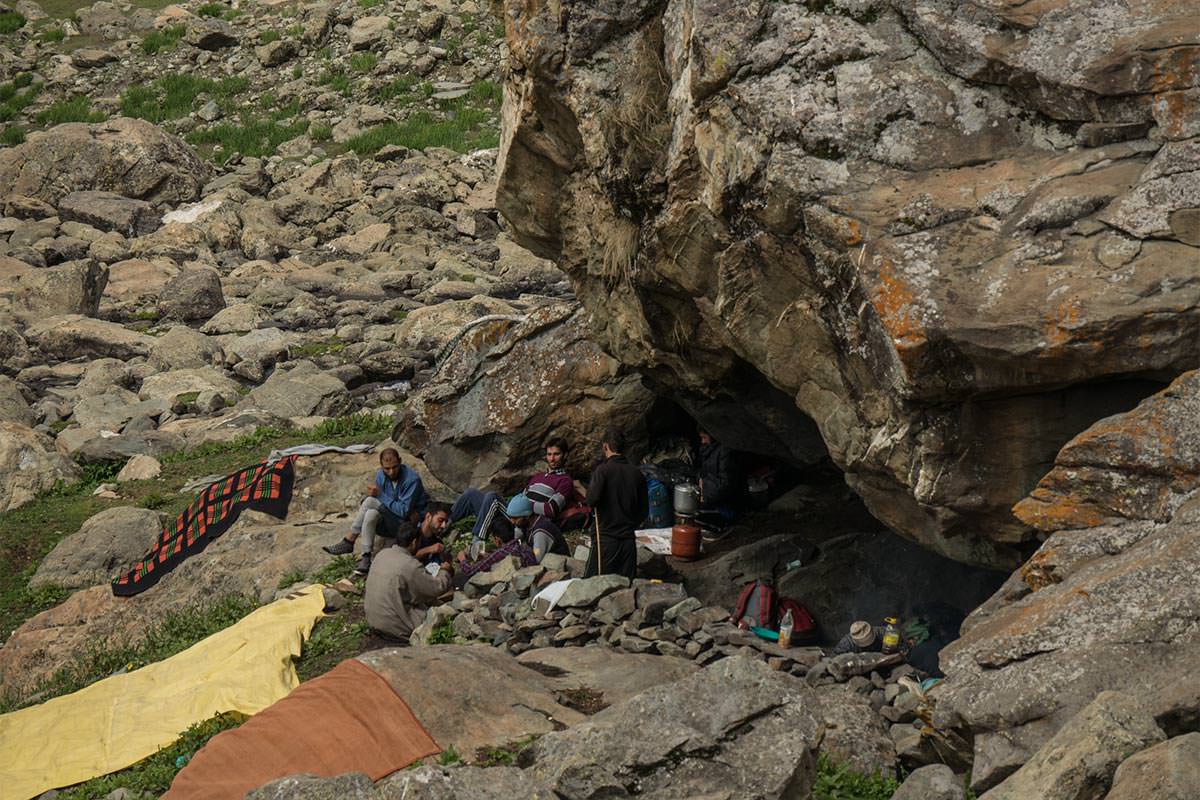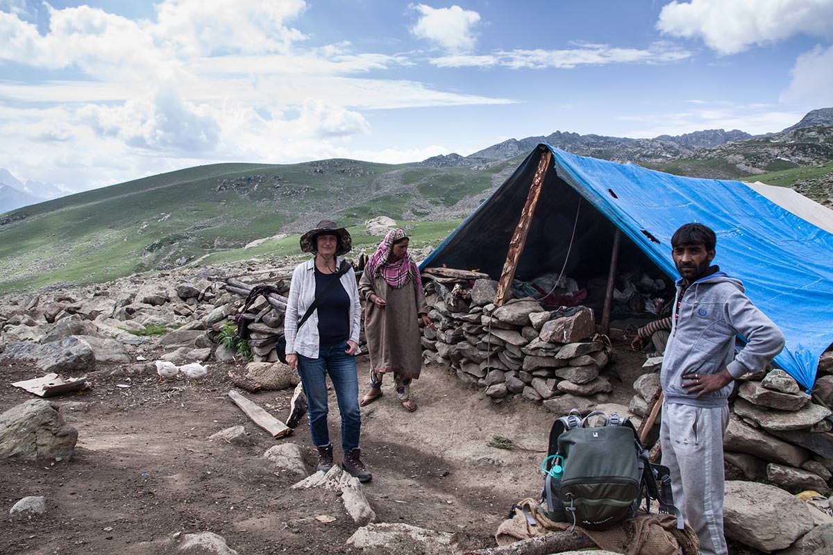 Ab Bodpathri sind die Anstiege nicht mehr so lang und steil, wir kommen gut vorwärts. Kurz vor der Siedlung Trunkhol gibt es bei der Familie eines unserer Begleiter noch einen Stopp, die Hütte ist gerammelt mit Nomaden aus der Familie und der Umgebung. Eine kleine Mahlzeit wird kredenzt und aus den Mienen der Hirten und wie sie uns mit leicht nach oben gedrehten Augen ansehen, glauben wir schließen zu können, wie sie unsere Vitalität und Fitness einschätzen. Bald sind die Weideplätze von Trunkhol erreicht, wir müssen uns polizeilich registrieren und unsere Führer sind der – von uns lebhaft geteilten – Auffassung, dass wir es heute nicht mehr bis zum Gangabal-See schaffen (was allerdings Voraussetzung wäre, wollten wir in der Zeit bis Sonamarg). Da haben sie wohl recht, wir sind fix und fertig, ein bisschen peinlich ist es schon, aber was kann man von Großstädtern schon verlangen. Wir errichten unser neues Zelt (s.d. unseren Zelt-Report), lecken unsere Wunden und warten auf das Abendessen, dass wir in großer Runde einnehmen.