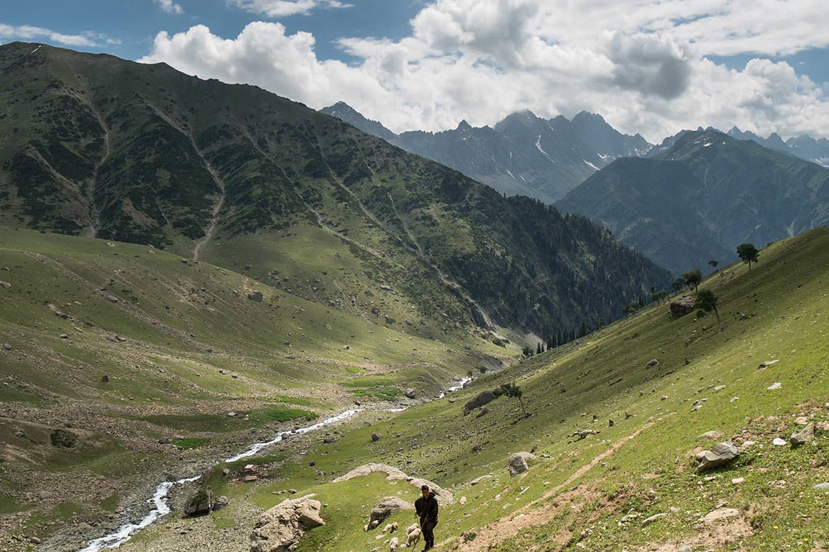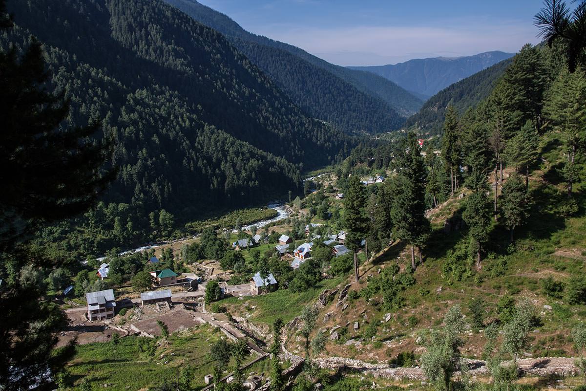 Am frühen Nachmittag erreichen wir Naranag (5 Stunden für 50 Kilometer, Hut ab!) und werden von unserem Führer R. in Empfang genommen. Er stellt sich uns als „Gypsy“ (Zigeuner) vor, wobei das Wort „Nomade“ wohl eher zutreffen würde. Als er uns mitsamt unserem Gepäck in sein Haus verfrachtet, fragen wir uns, was bei ihm von einem Zigeuner oder Nomaden noch übriggeblieben ist. Wie dem auch sei, in gebrochenem Englisch teilt er uns mit, heute sei ein Aufbruch unwahrscheinlich, es gäbe noch Probleme mit den Pferden (?), wir sollten uns in seiner Hütte wie zu Hause fühlen, was nicht so einfach ist. So nett sein Domizil von außen erscheint, inwendig ist es doch mehr denn schlicht. Unser Koch gibt uns in der Küche eine erste Kostprobe seines Könnens und im Gespräch (und nach eingehender Musterung) findet man heraus, dass wir uns den Plan, in 4 Tagen nach Sonamarg zu wandern, wohl abschminken könnten. Immerhin sind es fast 65 Kilometer und wenn wir nicht in exzellenter Kondition und höhenakklimatisiert seien, nee, wohl eher nicht. Aber versuchen könnte man es ja… Tolle Aussichten.