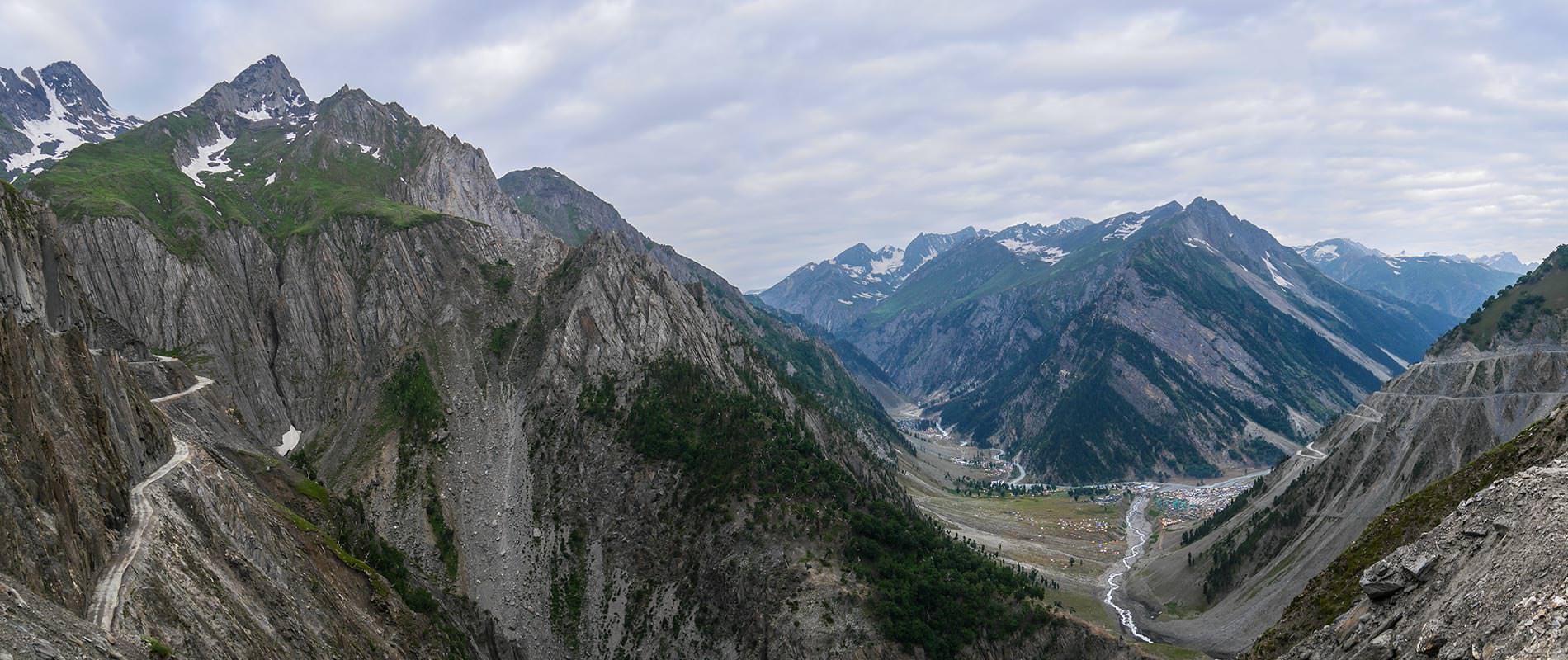 Wegen gewaltsamer Unruhen in Srinagar (2016), während derer es Tote zu beklagen geben wird, herrscht in der Stadt tagsüber Ausgangssperre. So werden wir erst/schon in den frühen Morgenstunden in Naranag abgeholt und sehen die ersten 51 Kilometer lediglich die Scheinwerfer der entgegenkommenden Fahrzeuge. In Sonamarg angekommen, gibt es eine „millek tea“-Pause, dann schraubt sich der SUV langsam zum Zojila Pass (3528 m) hinauf und bleibt hier auch prompt mit einem Radaufhängungsschaden liegen… Indische Fahrer kennen ihr Vehikel aber genau, eine halbe Stunde wird gehämmert, geleimt und gelötet, zum Abschluss etwas Tesa-Film darauf und die Fahrt geht – wegen losen bzw. gar nicht vorhandenen Straßenbelägen – zwar langsam, aber stetig weiter. Ja, Straßen…, wer im Hochgebirge in Asien schon mit Auto oder Bus unterwegs war, wird es wissen: Je höher es hinauf geht, umso schlechter werden die Beläge, in der Regel beherrscht die Schotterpiste das befahrbare Gebirge. Leitplanken sind teuer und schwer zu transportieren, also lässt man es besser gleich. Naturgemäß sind die Wege schmal, der (LKW-) Verkehr stark und überholen wird in diesen Regionen zum Russischen Roulette, der Griff zur Hyperventilations-Papiertüte hingegen normal. Oft genug schweift der Blick aus dem Beifahrerfenster in gähnende Abgründe, die hier und da mit den Gerippen von Fahrzeugen dekoriert sind, deren Fahrer für einen kurzen Moment unaufmerksam waren. Ab einem Zeitpunkt hofft man nur noch, dass der Fahrer genauso am Leben hängt, wie man selbst. Halleluja!
