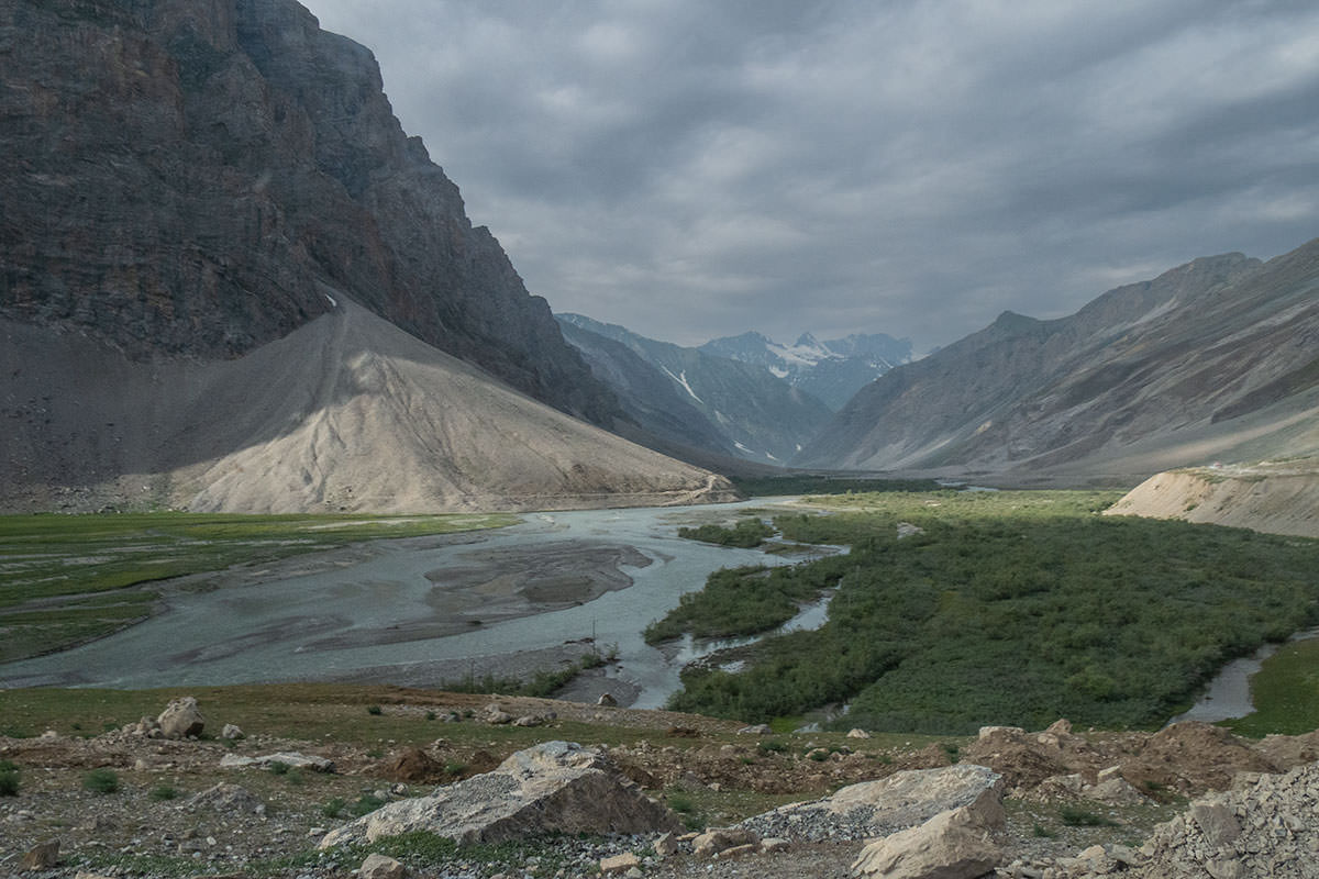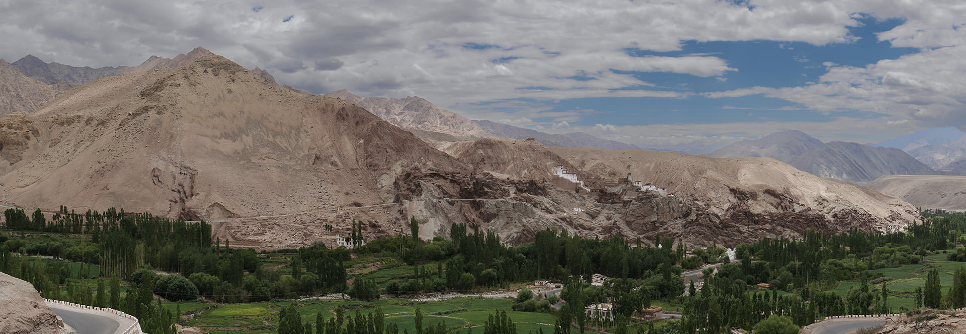 Lamayuru ist nicht nur wegen seines schönen Klosters bekannt, gemeinhin wird surreale Landschaft treffenderweise „Moonlands“ (Mondlandschaft) genannt. Unser Fahrer kuppelt aus (Schluck!) und wir rollen bergab bis an die Ufer des Indus. Noch eine Pause in Khalatse (muss man als Fahrer in Indien alle zwei Stunden pausieren? Aber es geht wohl mehr um den Smalltalk mit anderen Fahrern), von hier aus folgen wir dem Verlauf des Indus River durch mehrere kleine Siedlungen, die schon von weitem als grüne Punkte auszumachen sind und ein wenig an Wüsten-Oasen in Ägypten erinnern. Am Zusammenfluss von Indus und Zanskar nahe Nimdo dürfen wir noch einmal austreten, danach geht es ohne nennenswerte Verzögerung zum Busbahnhof von Leh.