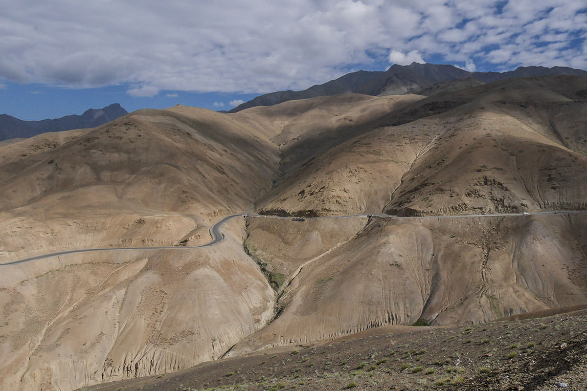Die erste Stunde geht es durch eine schmale Schlucht, winzige Felder und Obstgärten säumen die Straße, die auf etwa dreißig Kilometer aufgerissen ist, da sie neu geteert werden soll. Sofern LKW oder andere PKW vor uns fahren, wirbeln diese einen Staub auf, der bis in den Himmel reicht und trotz geschlossener Fenster den Weg ins Wageninnere findet. Zu viert husten wir uns die Seele aus dem Leib. In der kleinen Gemeinde Mulbekh, etwa 40 Kilometer südöstlich von Kargil, ändert sich einiges: Hier stehen einträchtig Moschee neben buddhistischem Tempel, Architektur und Physiognomie der Einwohner werden tibetischer. Nach einer obligatorischen Frühstückspause mit Samosas und Milchtee verlassen wir Mulbekh und je weiter wir uns von diesem Ort entfernen, um so „ladakhischer“ wird die Umgebung. Sand, Steine und Felsen türmen sich bis in den Himmel auf, unser Jeep folgt der Straße, die sich durch diese unwirtliche und unwirkliche Gegend wie eine gigantische Schlange mit Magenkrämpfen windet. Das Fahrzeug ächzt über zwei Pässe, den Namika Pass (3.700 m) und den Fotu La (4108 m), von denen man einen Ausblick auf diese mondartige Landschaft hat und sich ganz plötzlich sehr winzig fühlt…