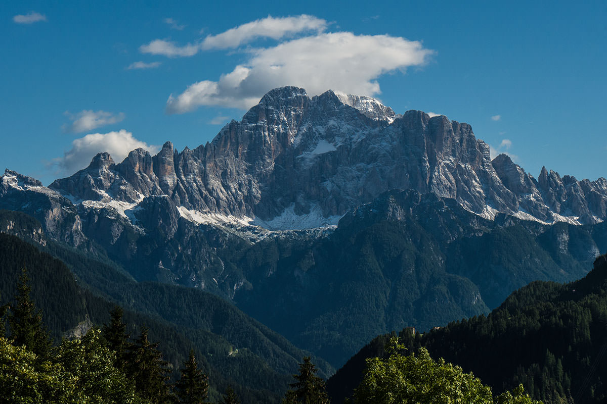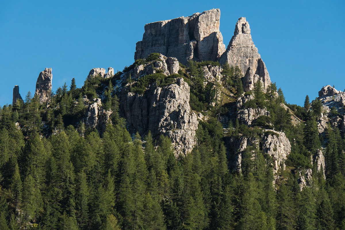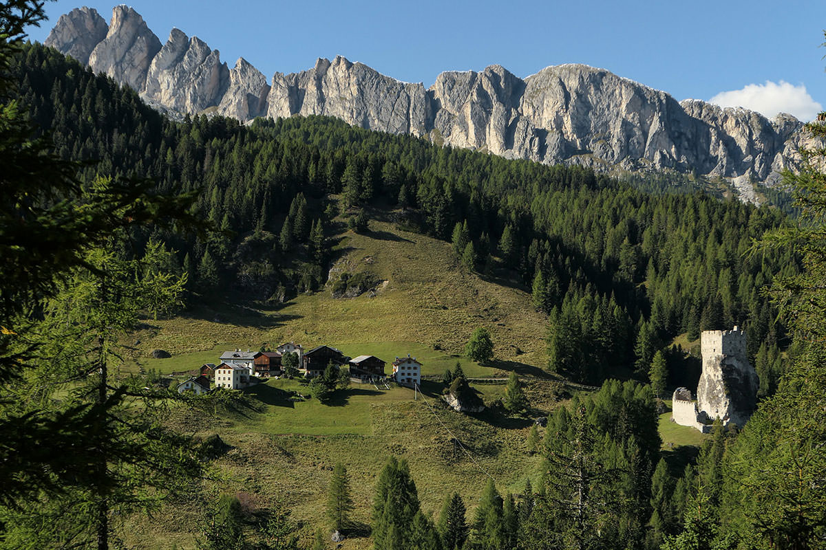 Vorbei geht es am Col di Lana, einem 2462m hohen Berg in der Fanesgruppe und nach knapp 20 Kilometern (von Arabba) ist der Passo di Falzarego (2105m) erreicht. Dieser Pass ist Teil des Dolomiten-Hauptmassivs der Tofane; zu sehen ist hier der Felsstock des Kleinen Lagazuoi (2.762 m), im Westen ist die Marmolata und im Süden der Monte Averau (2.649 m) sowie die fünf Zacken der Gruppe Cinque Torri zu sehen. Kurz vor dem Pass lohnt sich ein kleiner Abstecher zum Schloss Buchenstein (oder auch Burg Andraz), einem gewaltigen Steinbau aus dem Jahr 1000. Diese Burg diente in erster Linie der Sicherung der „Eisenstraße“ in dieser Region.