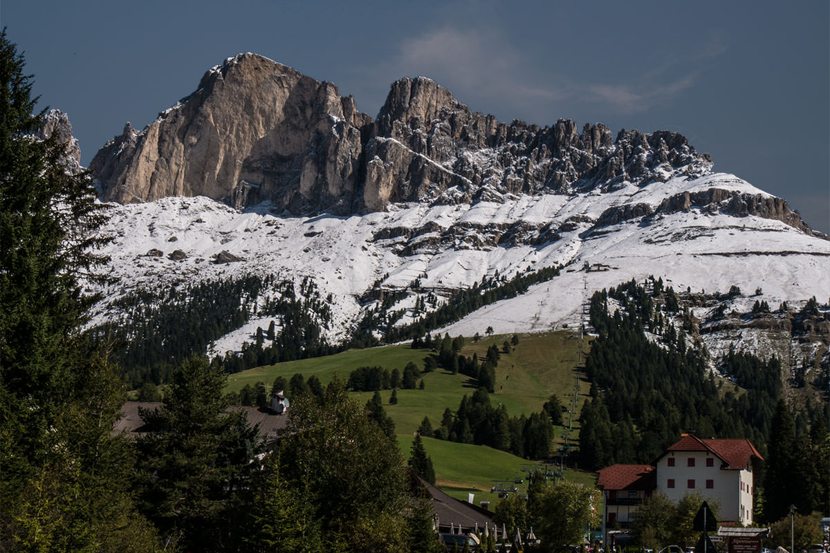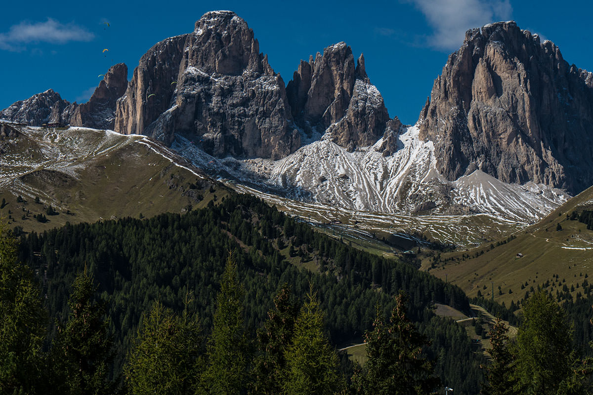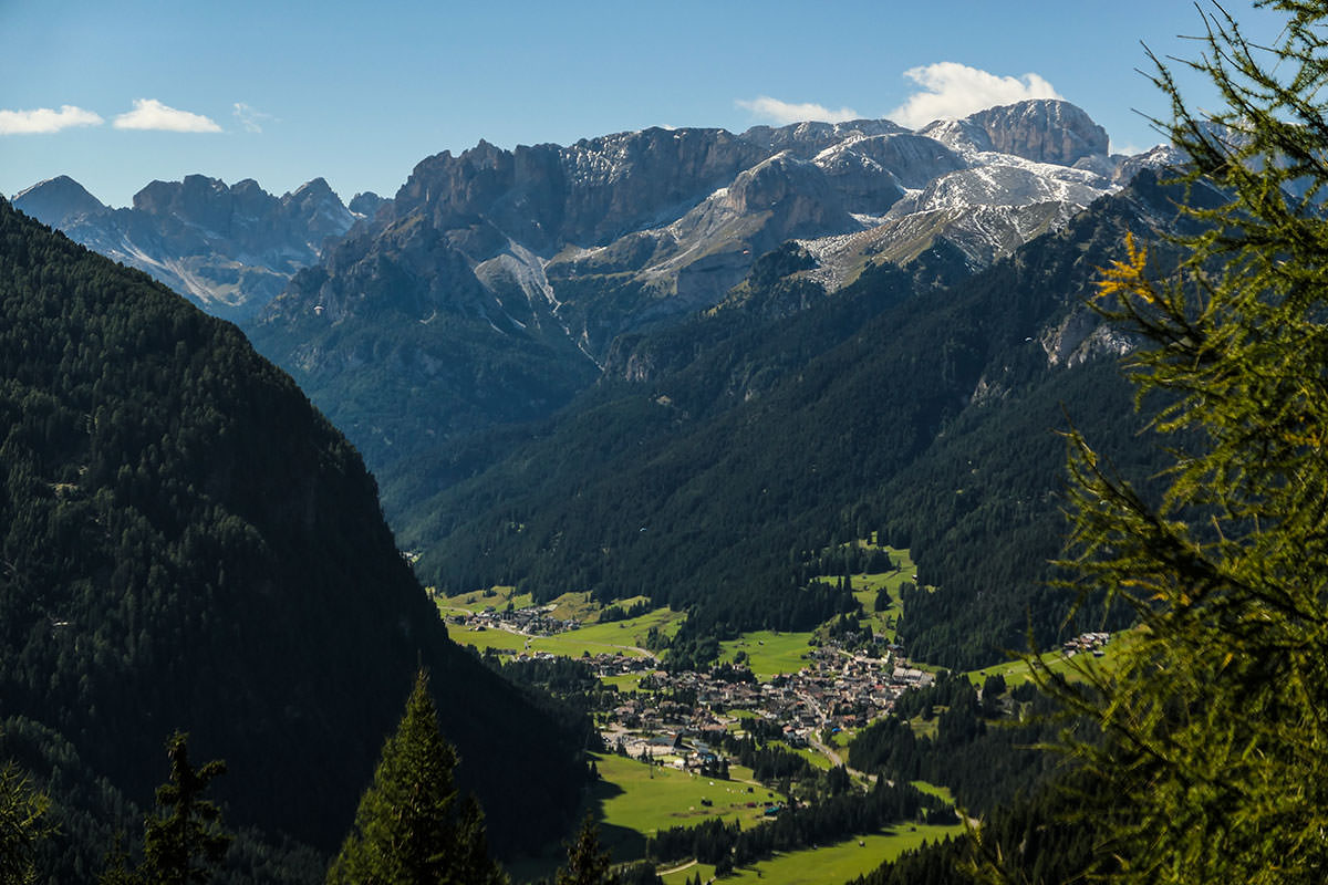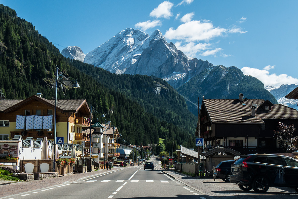 Auf verschnörkelter Straße fahren wir ins Fassa-Tal, in Vigo di Fassa halten wir uns nicht lange auf, langsam wird uns klar, dass es ein langer Tag werden wird, da wir alle naselang stehen bleiben und die Aussicht bewundern. Zudem verpassen wir um ein Haar die richtige Ausfahrt, denn die Dolomitenstraße verläuft nun auf der SS48. In dem kleinen Ort Canazei gibt es dann am Ortsausgang in einer kleinen Trattoria die verdiente Mittagspause, statt Pommes-Currywurst gibt es viele Sorten Pasta und einen Grappa zur besseren Verdauung. Canazei ist ein Winter- und Sommersportort und scheint ein El Dorado für Paraglider zu sein, am heutigen Tag sind die Fallschirme am Himmel so zahlreich wie die Samen einer Pusteblume im Herbstwind. Canazei ist zudem Knotenpunkt der Dolomitenpässe Pordoijoch (ins Arabba-Tal) und Sellajoch (nach Wolkenstein in Gröden). Außerdem kommt erreicht man über den Passo Fedaia nach Malga Ciapela und Rocca Pietore in der Provinz Belluno. (Auch über diesen Weg gelangt man nach Cortina, verpasst allerdings den schönen Pordoi-Pass.)