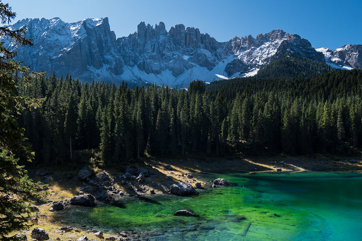 Der Karersee ist ein weiteres Highlight der ersten Etappe. Der legendenbehaftete See schillert in vielen Farben (vornehmlich smaragdgrün), im Wasser spiegeln sich die Kerzen des Latemar-Bergstocks, dieses Schauspiel zieht natürlich Herden von Touristen an. Selbst die österreichische Kaiserin Elisabeth (Sisi) war von diesem Farben-Feuerwerk fasziniert, und wenn sie den See in den Ferien besuchte, übernachtete sie im nahegelegenen Grand Hotel, das in der Vergangenheit auch andere Berühmtheiten, wie etwa Agathe Christie, Winston Churchill oder Karl May beherbergte.