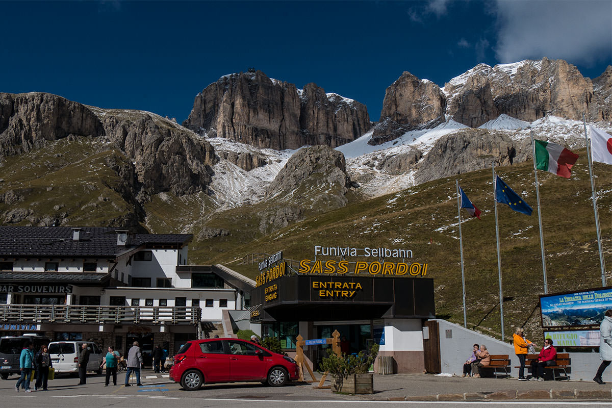 Am Pordoi-Pass ist ordentlich was los, selbst große Reisebusse finden ihren Weg hier hinauf und da nimmt es wenig Wunder, wenn hier für das leibliche Wohl gesorgt wird und diverse Aktivitäten möglich sind, u.a. eine Fahrt mit der Gondelbahn zum 2.950 Meter hohen Sass Pordoi. Die Aussicht vom Pass oder vom Sass ist grandios, im Nordwesten sieht man den Langkofel (3181m), den zum Sella-Massiv gehörenden Plateaufelsen Sass Pordoi (2950 m), den Sass de Forca (2917 m) und die Felsspitze Piz Boè (3152 m). Im Süden erblickt man den nördlichen Vorkamm der Marmolata-Gruppe mit dem Belvedere (2510 m) und Porta Vescovo (2562 m). Die Aussicht nach Osten reicht über Arabba hinweg auf die Fanesgruppe und Le Tofane.