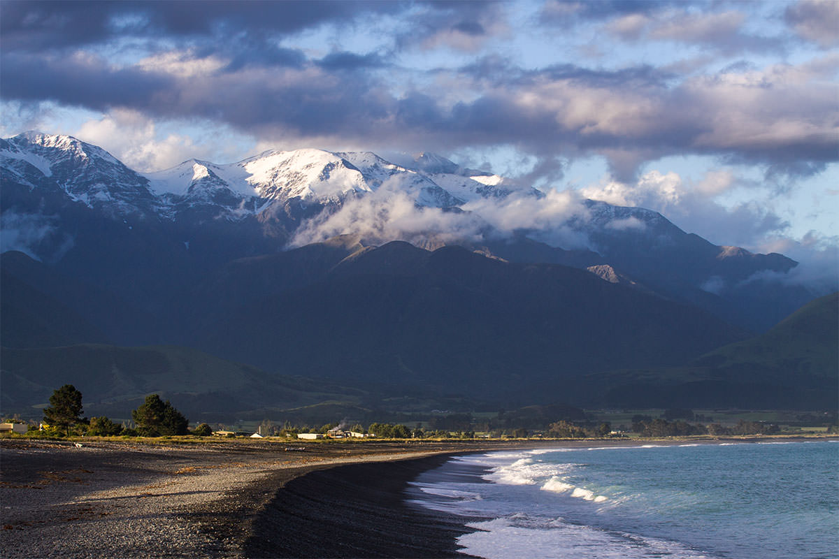 Am späten Nachmittag erreichen wir endlich Kaikoura. Viel hat dieser ehemalige Fischerort nicht zu bieten, berühmt ist er jedoch für die fast garantierte Gelegenheit, Pottwale, Orcas und Delfine in ihrem nassen Element zu observieren, wenn man das Glück hat, eine Passage auf einem der Walbeobachtungsboote buchen zu können. Dies ist in der Hochsaison eine Unmöglichkeit, alle Schiffe scheinen für die nächsten 400 Sommer ausgebucht, lediglich ein Trip zu den Robben am Ohau Point wäre noch buchbar, so die Auskunft des Veranstalters. Nun ja, das wäre eine Idee, kämen wir nicht schon von dort. So passt man sich den Umständen an, ein Ausflug auf die Kaikoura Peninsula, die wie das Holzbein eines Seeräubers in die See hineinragt, ist zwar kein Ersatz für das Beobachten der Wale, aber Stelzvögel und Robben, denen man hier gefährlich nahe kommen kann, haben auch ihren Reiz. Auf der Rückfahrt ins Dorfzentrum passieren wir eine Fischbude, die nach eigener Werbung die besten Langusten zubereitet (oder Langusten am besten zubereitet?). Wie das so mit Werbung ist: was dem Braten an Geschmack fehlt, Kochkunst können wir hier leider nicht attestieren, macht er durch eine berauschende Farbvielfalt wett. Nicht nur auf unseren Tellern geht es bunt zu, ein herrlicher Sonnenuntergang über dem Meer und der schneebedeckten Kaikoura-Gebirgskette, das Rauschen des Ozeans und das Schnattern der gefiederten Freunde…, wer braucht schon einen Sitzplatz in einem Walbeobachtungsboot?