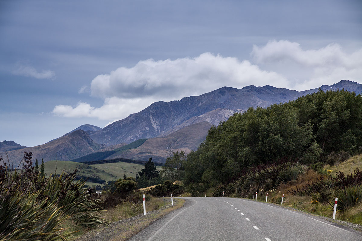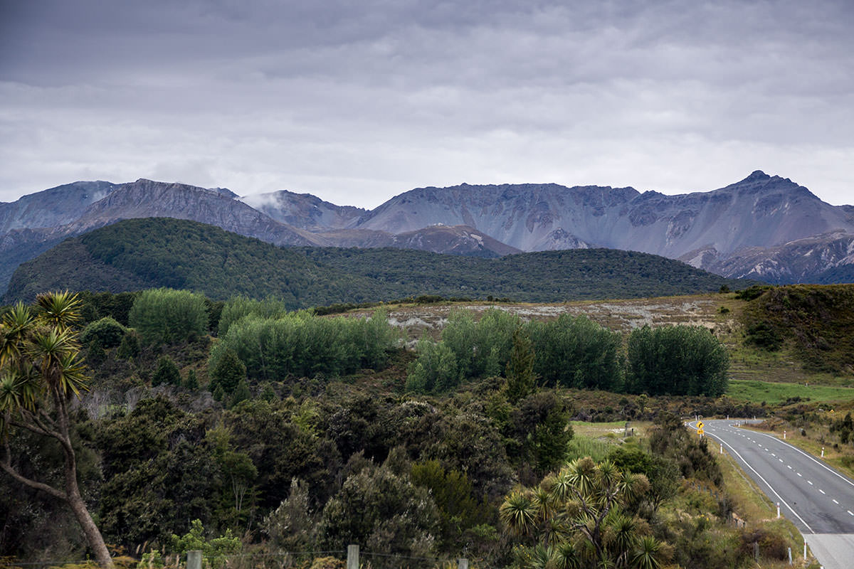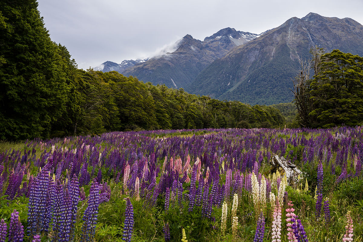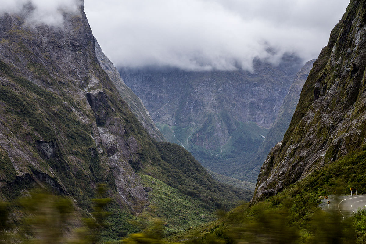 Die Milford Road folgt den ersten 30 Kilometern der Uferlinie des Te Anau-Sees, bevor sie an den Te Anau Downs (hier hat man noch einmal einen exzellenten Blick auf Murchinson Mountains) in nordöstlicher Richtung ins Landesinnere abknickt. Durch Tussock-Steppen und Buchenwälder führt die Straße ins Eglington Valley, das beidseitig von steilen Bergen flankiert wird. Bei Kilometer 60 stößt man auf die Mirror Lakes (Spiegelseen), in deren Oberfläche bei ruhigem Wetter die umherstehenden schneebedeckten Berge ihr Bild zurückwerfen. Nicht lange und wir sind an Knobs Flat, die hiesigen Toiletten sind nicht so sehenswert wie die herrlichen Lupinenfelder rundherum. Am Lake Gunn (Kilometer 75) kann man sich auf einem Rundweg durch einen steinalten Rotbuchenwald die Beine vertreten, um den See herum stehen einige schneebedeckte Gipfel, u.a. der Consolation Peak (1851m). Am Ende des See liegt der 532 Meter hohe Pass The Divide, der niedrigste Ost-West-Pass in den südlichen Alpen und Ausgangspunkt mehrerer Trekkingtouren. Wenig später könnte man in das Hollyford Valley abzweigen, wenn man denn wollte, will man nicht, kann man von der Straße wenigstens ein Foto vom Tal schießen. Der moderate Hollyford Valley-Track führt den Wanderer in eine alte Zeit zurück, in eine spektakuläre Landschaft aus Bergen und Urwald und einer faszinierenden Geschichte menschlichen Bemühens, diese wilde Gegend zu besiedeln. Fast 100 Kilometer sind geschafft, vom Monkey Creek hat man eine gute Aussicht auf das obere Hollyford Valley und eine gute Chance, Keas oder Whios (Blauenten, Hymenolaimus malacorhynchos) zu sehen. Etwas weiter nordwestlich steht man plötzlich vor der Darran-Bergkette, die bis in die 50er Jahre des letzten Jahrhunderts den Zugang zum Milford Sound für Fahrzeuge versperrte. 1935 wurde mit dem Bau des Homer-Tunnels begonnen, der nach dem Landvermesser William Homer benannt wurde, welcher 1889 dieses Gebiet erkundete und schon damals vorschlug, einen Weg durch die Darran-Berge zu brechen. Das Unternehmen startete mit fünf Arbeitern (später waren es mehr), die bereits 1940 nach 1,2 Kilometern harter Arbeit in 945 Metern Höhe den Durchbruch ins Cleddau Valley schafften, allerdings war die Röhre für Fahrzeuge zu dieser Zeit noch zu schmal. Während des Krieges lag die Baustelle brach, erst 1945 wurden die Arbeiten wieder aufgenommen und 1954 schließlich erfolgreich abgeschlossen.