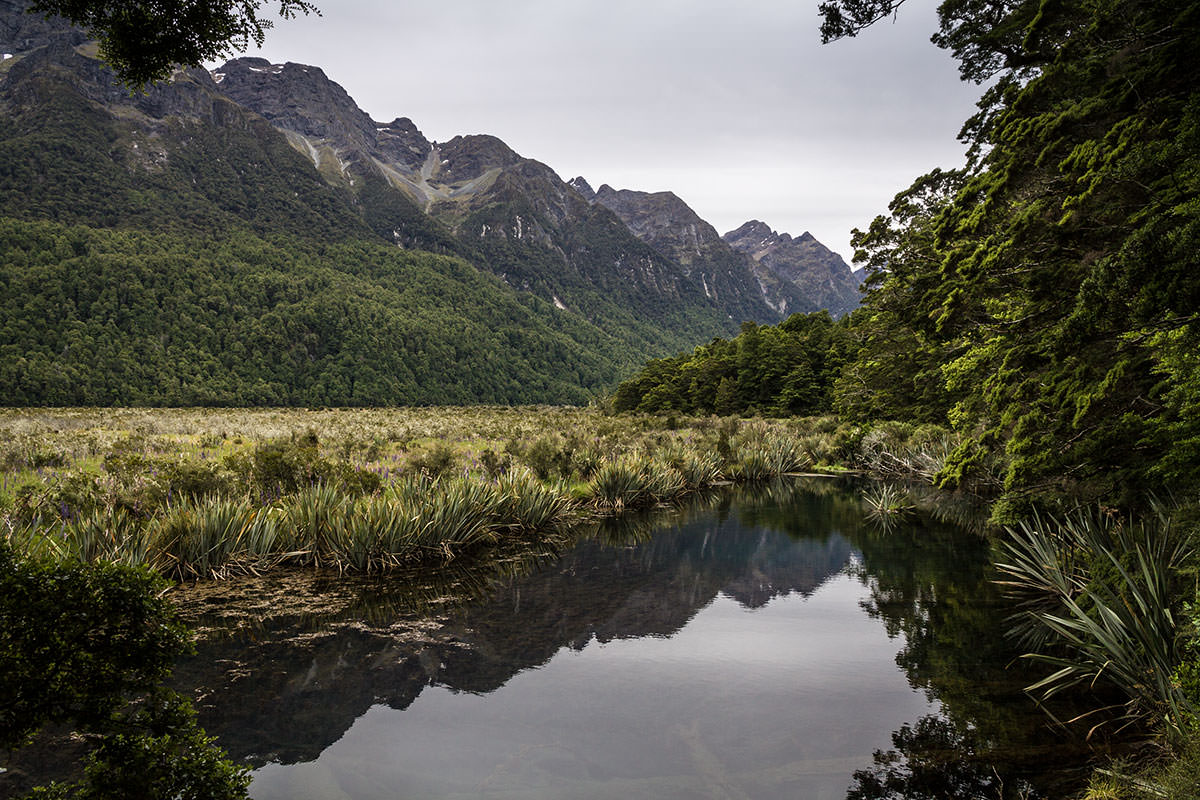 Die letzten 10 Kilometer entlang des Cleddau-Flusses passiert nicht mehr viel, die Fahrt geht durch alte Buchen- und Podocarp-Wälder, vorbei an einigen historischen Brücken und schließlich, am Ende der Milford Road wird der Blick frei auf den Milford Sound und das unverwechselbare Profil des Mitre Peak.