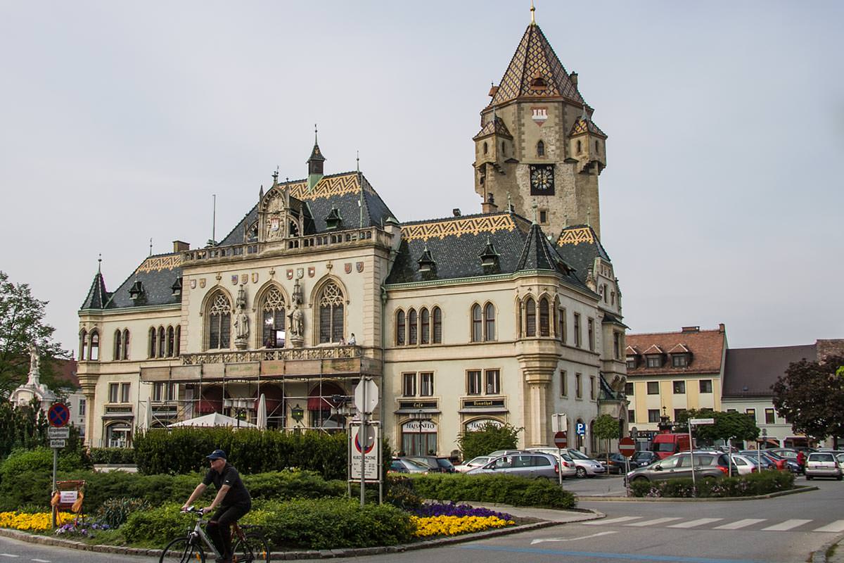 Bald ist Korneuburg mit schmuckem Rathaus erreicht; bei „Hofer“, vergleichbar mit Aldi, gibt es keine Trockenkaffeemilch, und so wird morgen ein „schwarzer“ Tag werden. Korneuburg liegt unmittelbar an den nördlichen Ufern der Donau, Wien hingegen auf der Südseite des Stroms. Die Korneuburger, nicht unpfiffig, haben für Reisende mit dem Ziel Wien eigens eine Donaufähre eingerichtet, die uns nach kurzer Wartezeit flugs an das andere Ufer nach Klosterneuburg bringt. Diese Fähre wird übrigens nicht mit der Kraft von Motoren bewegt, sie hängt vielmehr an Seilen und wird lediglich von der Flussströmung getrieben. Interessant. Der Arbeitstag ist für heute schon vorbei und auf dem Campingplatz in Klosterneuburg begegnen uns zum ersten Mal (!) Radreisende: ein holländisches Ehepaar (ganz begeistert, weil wir das gleiche Zelt haben) ist auf dem Weg nach Asien und zwei Schweizerinnen, die noch gar nicht so genau wissen, wohin es sie treiben wird…