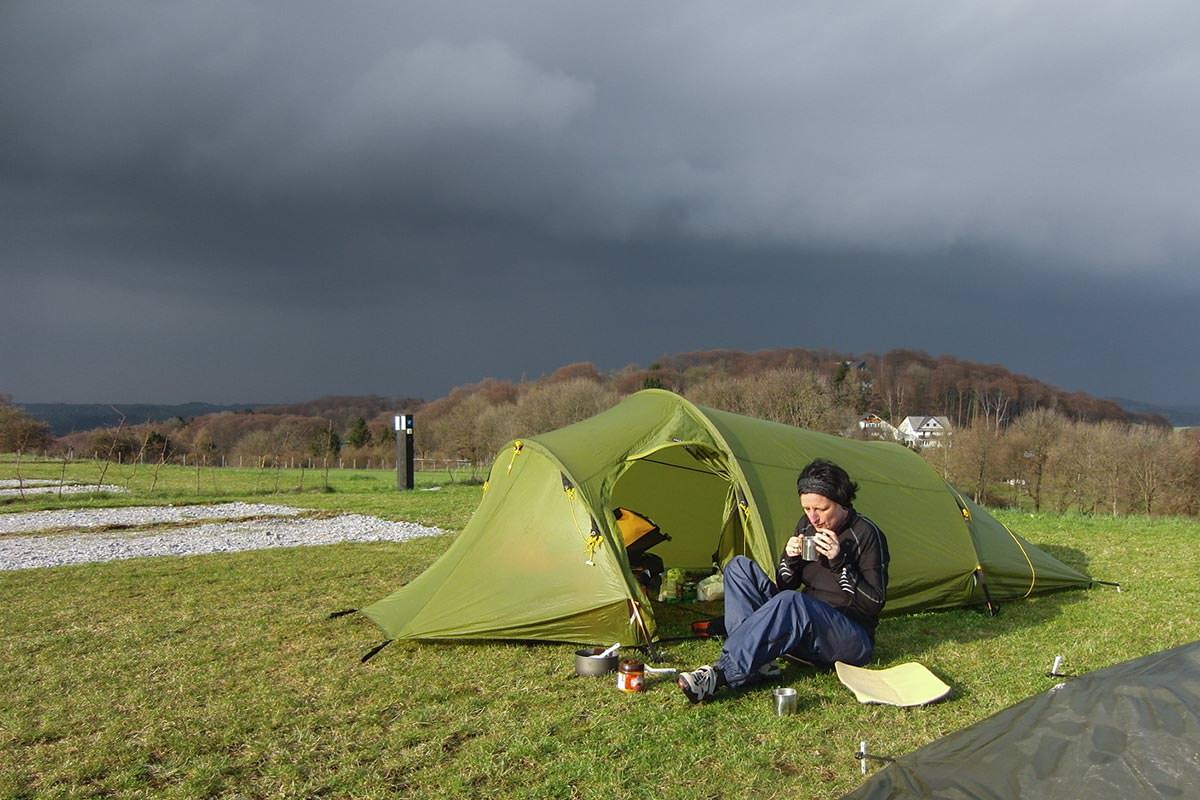 Eines steht jetzt schon fest: Wir werden kleinere Brötchen backen müssen! Nicht allein, dass wir fast 2 Stunden benötigen, bis wir unseren Camping-Plunder wieder verstaut haben, das ist lediglich peinlich. Das höllisch schmerzende Gesäß, die Beine, die wie nicht zum Körper gehörig herumschlackern und die anderen Extremitäten, die bereits am zweiten Tag von der Sonne verkohlt sind, verheißen in der Summe nichts Gutes. Nichtsdestotrotz quälen wir uns an diesem Tag zum Möhnesee im Sauerland. Das Wetter wird schlechter, schon am Mittag setzt heftiger Regen ein, der uns auch noch in den Schlaf lullt und unser neues Zelt einer ersten Qualitätsprobe unterzieht.