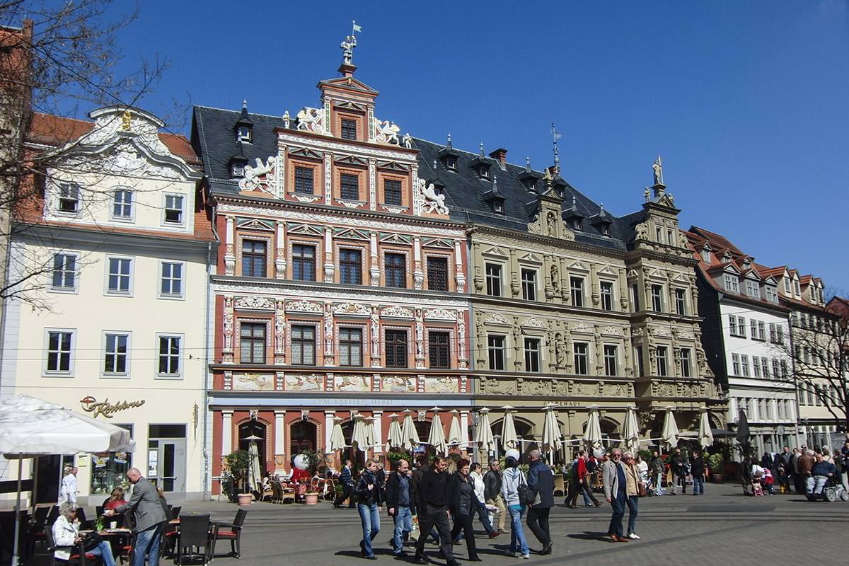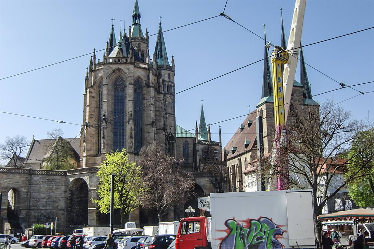 Mit Entsetzen stellen wir fest, dass wir viel zu weit nach Süden abgedriftet sind, denn eigentlich steht Dresden als letzte große deutsche Stadt auf dem Plan, bevor wir uns nach Tschechien begeben. Der gestrige Rückenwind bleibt uns jedoch bis Erfurt erhalten, die knapp 30 Kilometer vom letzten Schlafplatz bis in die Hauptstadt Thüringens sitzen wir auf einer Backe ab. Erfurt präsentiert sich ebenfalls in einem farbenfrohen Post-Wiedervereinigungs-Gewand, in der ansehnlichen mittelalterliche Altstadt mit zahllosen Fachwerkbauten laden Straßencafés zur Einkehr, von hier lässt sich vortrefflich das bunte Treiben der Menschen beobachten. Der steinalte Dom, Wahrzeichen der Stadt, die Stadtmauern und das schöne Wetter rechtfertigen einen längeren Aufenthalt und Sabine ersteht in einem gut sortierten Radsportgeschäft ein paar Armlinge, da sie angesichts der häufiger werdenden Sonnentage um den Teint ihrer oberen Extremitäten besorgt ist.