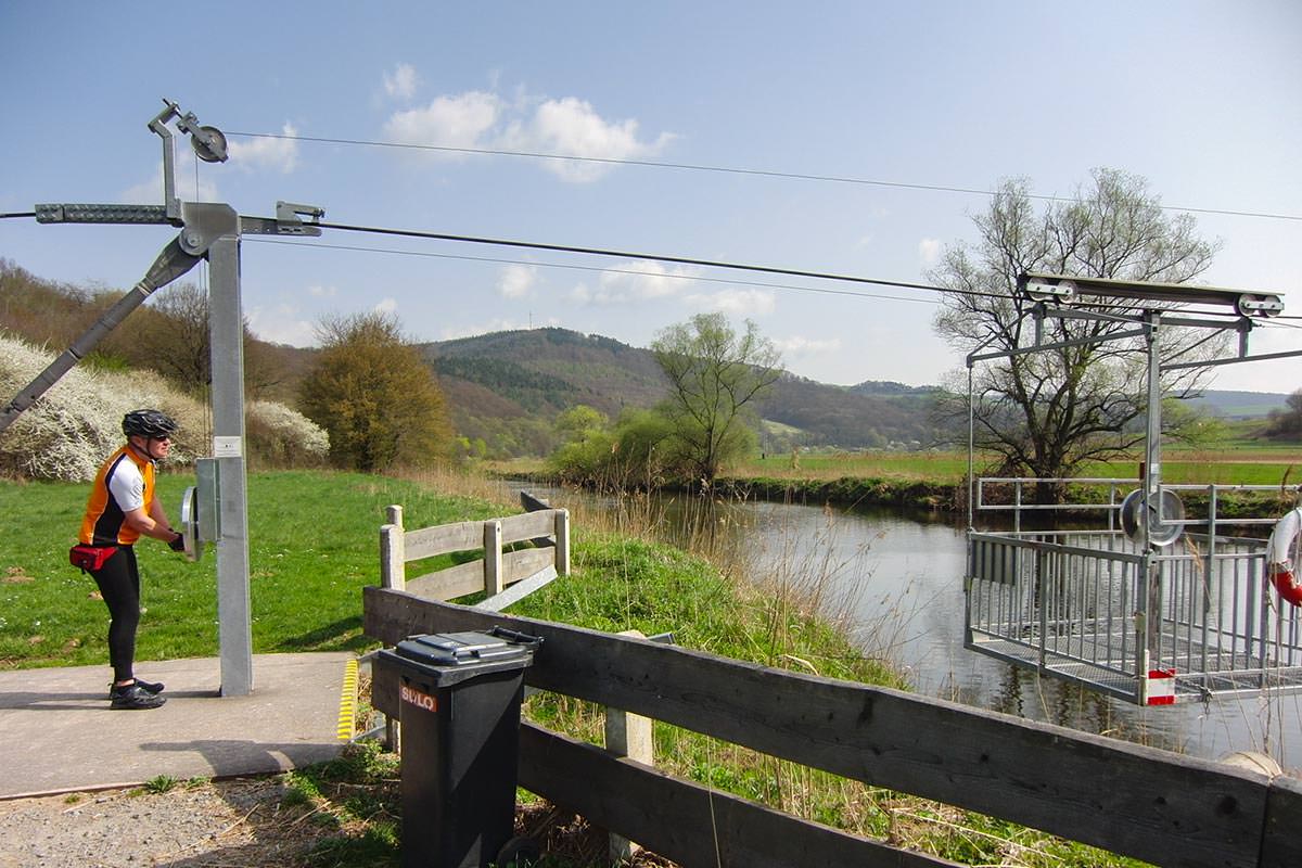 Endlich, das Wetter bessert sich und als wäre dies nicht genug, zeigt sich das Straßenprofil zunehmend bergiger, Schluss ist es mit dem „langweiligen“ Geradeausfahren. Für uns aus dem Ruhrpott allerdings eine rechte Herausforderung. Eine Zeitlang geht es durch Felder und 100-Seelen-Dörfer (von denen die Hälfte auf ‚-hausen‘ endet) und kurz hinter Malsfeld müssen wir uns in einem Drahtkorb eigenhändig über die Fulda an das andere Ufer leiern, eigentlich lustig, aber auch strapaziös.