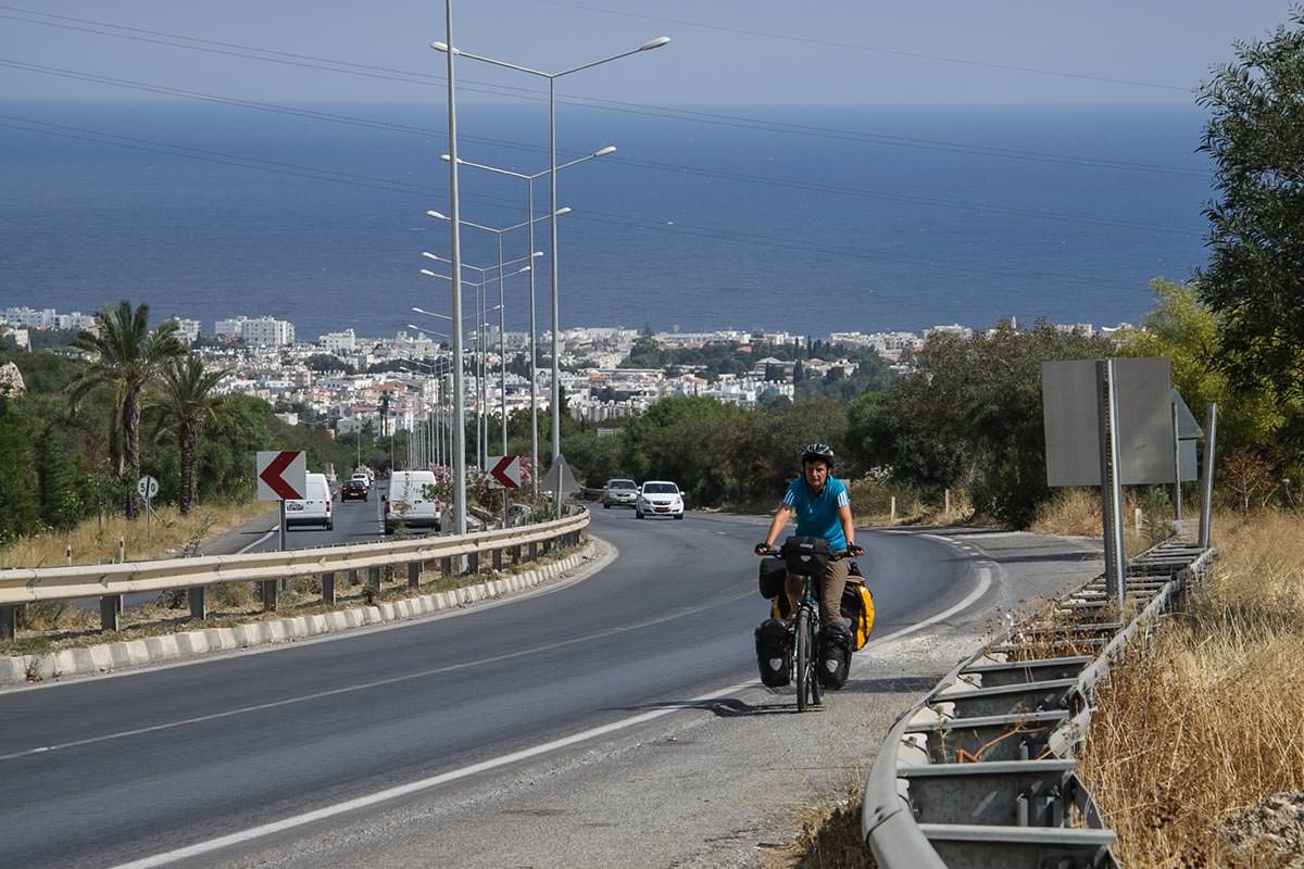 Wir verlassen Girne bereits am nächsten Tag, Zypern ist nur Transit für uns und angesichts der auf uns zukommenden Kosten wollen wir den Aufenthalt recht kurz halten. Zunächst werden wir mal wieder mit einem Anstieg konfrontiert, fünf Kilometer geht es bergauf in die Besparmak-Berge, keine einfache Angelegenheit bei diesen Temperaturen. Die Belohnung folgt aber prompt, von der Passhöhe geht es fast nur noch bergab bis in die Hauptstadt Lefkosa oder Nikosia. Im Rückspiegel sieht man in den Bergen eine gigantische türkische Fahne, die dort in den Fels gezeichnet oder sonst wie angebracht wurde. Es geht doch nichts über eine gute Prise Nationalismus. Oder? Seit 1974 ist Zypern nunmehr geteilt und der türkische Nordteil wird nur von den Türken völkerrechtlich anerkannt. Zypern ist schon ein wenig seltsam und erinnert ein etwas an die Zeiten von BRD und DDR, auch wenn sich hier auf der Insel zwei Volksgruppen gegenüberstehen. Wie aber so oft, dem kleinen Mann ist es piepegal, ob jemand Türke oder Grieche, Moslem oder Christ, schwarz oder weiß ist, letztlich sind es immer nur die Interessen weniger, die unsere Welt in dieses globale Durcheinander, diesen Hass und Neid geführt haben bzw. führen.
