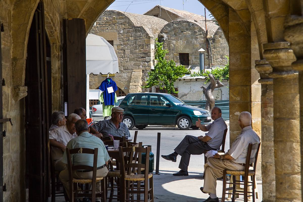 Speisekarte auf GriechischNach knapp vier Stunden Fahrzeit sind wir in Larnaka. Wollen hier noch ein wenig Strandurlaub machen. Ha, guter Witz. Die Hotels am Strand sind unbezahlbar und der Strand ist eigentlich auch nicht so toll, links sieht man große Kräne einer Werft oder eines Containerumschlaghafens und rechts riesige Benzintanks. Aber der Aufenthalt ist aber doch ganz amüsant, ist das Hotel doch rammelvoll mit älteren Damen aus England, die noch Rüschenblusen tragen, den kleinen Finger abspreizen, wenn sie die Tasse mit dem „Five o’clock tea“ zu Munde führen und die perfektes, wohlakzentuiertes British English parlieren. Herrlich!