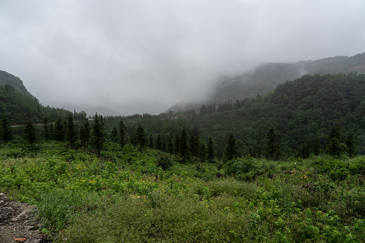 Dingxiao ist nicht groß und die Stadtgrenze schnell erreicht. Für die nächsten 40 Kilometer werden wir – mit Unterbrechungen – dem Guanxing Highway folgen, der mehr oder minder parallel zur Autobahn S85 verläuft. Mehrere Abschnitte stehen allerdings unter Reparatur und Umwege sind nötig, bis hin zu einer Querfeldeinfahrt. Das Gebiet ist von Landwirtschaft geprägt und die Ortschaften entlang der Route zählbar. Seit Dingxiao geht es permanent bergauf und ein paar Kilometer hinter Yuzhang erreichen wir bei 1623 Metern den höchsten Punkt der gesamten Tour. Die längere Abfahrt nach Xingren erledigen wir wohl zu schnell, da wir den Ort, der wenig einladend ist, bereits um die Mittagszeit erreichen. Xingren böte jedoch mehrere Übernachtungsoptionen, weiter nördlich sieht es diesbezüglich eher trist aus. Ein kompetent dreinschauender Ladenbesitzer weiß indes zu 100 %, dass in der etwa 10 Kilometern Richtung Norden entfernten Ortschaft Gaowu ein Hotel sei und er weiß auch, dass wir nie zurückkommen und ihn für fehlerhafte Infos zur Rechenschaft ziehen werden. Bis Gaowu geht zwei Drittel bergauf und ein Drittel bergab, entlang des Weges ist die Landschaft bukolisch, durchsetzt mit kleinen Weilern und Dörflern, die ihre Felder noch mit Hand und Ochs beackern. In Gaowu gibt es natürlich kein Hotel (eine Eigenschaft der Chinesen ist, den Fragenden nie mit einer negativen Auskunft zu entlassen), überhaupt hinterlässt der Ort den Eindruck der Isolation, die Bewohner sehen auf die eine oder andere Weise miteinander verwandt aus, auf unsere Fragen hin schauen sie uns schwerfällig an, wiederholen unsere Fragen gebetsmühlenartig und gehen kichernd ihrer Wege. Am Ortsausgang von Gaowu erfahren wir in der örtlichen Polizeidienststelle (die Beamten scheinen von auswärts), dass wenigstens im 11 Kilometer entfernten Xiashan (下山) mit Herbergen zu rechnen sei. Noch einmal geht es für 3000 Meter in Serpentinen bergauf, der Rest ist flach, nach Xiashan geht es gar talwärts. Direkt am Ortseingang finden wir ein kürzlich eröffnetes Hotel, die Einrichtung ist neu und staubig und, da die einzigen Gäste, werden wir ordentlich bemuttert. Rasch noch einen Hotpot im nächsten Restaurant (lokaler Geheimtipp) leergelöffelt und vom Zimmerfenster können wir ein herrliches Gewitter in den Bergen beobachten.