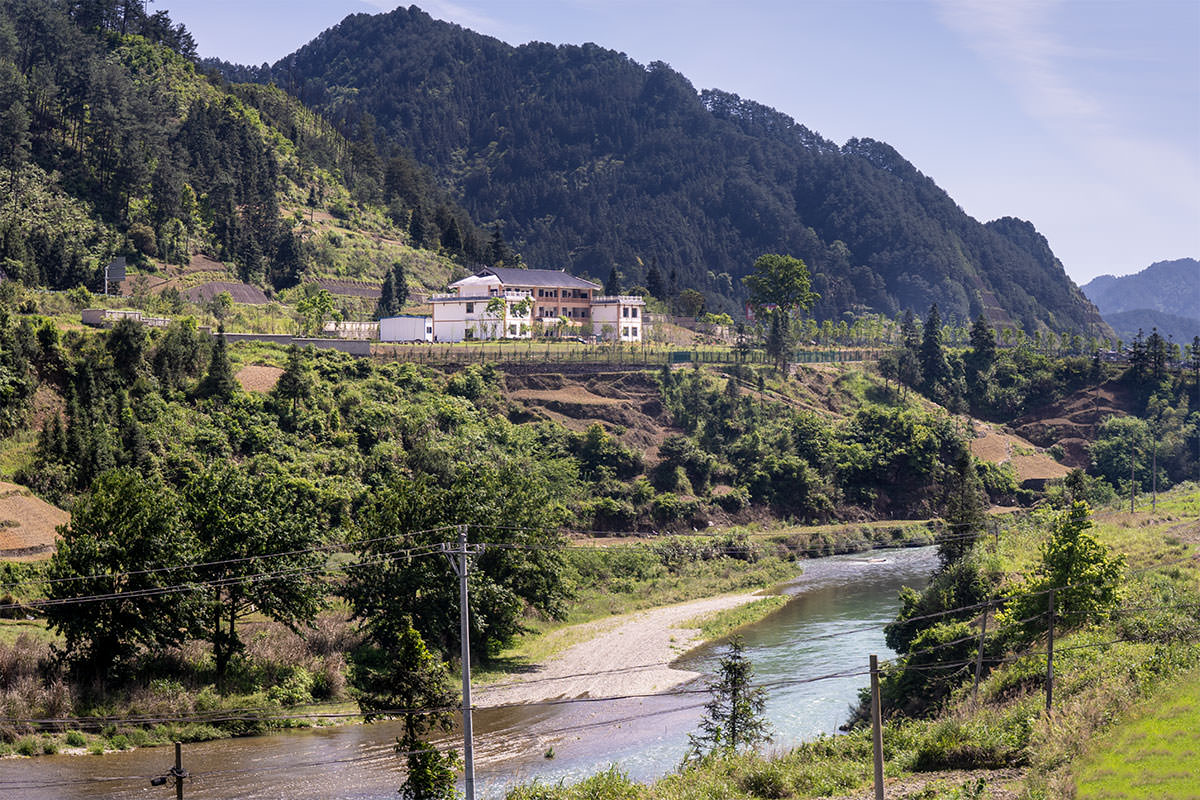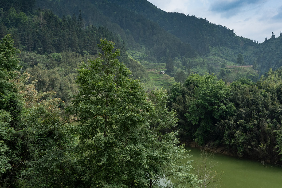 Die letzte Etappe wird auch die längste sein. Nachdem es in der letzten Nacht heftig regnet und die Temperaturen bereits am frühen Morgen über 25 Grad liegen, stellen wir uns schon zum Start auf eine schweißtreibende Tagesetappe ein. Entgegen allen Verlautbarungen ändert sich übrigens der Zustand der S308 auf den ersten zehn zu fahrenden Kilometern im Vergleich zum Vortag nicht wesentlich und wir kommen zu dem Ergebnis, dass es (im Chinesischen) für die Beschaffenheit einer Fahrbahn keine objektiven Kriterien zu geben scheint. Fast 20 Kilometer geht es – seit wir Yongle verlassen haben – munter bergauf und bergab und die Fahrt gipfelt auf einem Gebirgspass (bei dem Dorf Wujixinzhai), der, obgleich nur 780 Meter hoch, das Letzte von uns einfordert. Ein oder zwei Kilometer hinter dem Pass folgt eine längere Abfahrt, die dann die Schweißbäche versiegen lässt, indes immer wieder von Baustellen und Wartezeiten an Ampeln unterbrochen wird. Entschädigt werden wir allerdings durch eine herrliche Natur mit bewaldeten Hügeln, in deren künstlichen geschaffenen Lichtungen Reis in Terrassen angebaut wird.