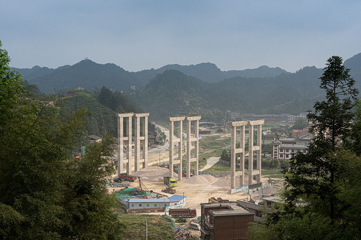 Die heutige Etappe ist nicht besonders lang, aber was sie wirklich schwer machen wird, ist – abgesehen von den Anstiegen – der schlechte Zustand der Fahrbahn. Schon kurz vor dem Miao-Dorf Datang (大塘苗寨) beginnen die Baustellen des neuen Highways Kaili-Rongjiang, halbfertige Brücken und Tunnel verschandeln die schöne Landschaft und Lkws fahren Abraum wie von Sinnen hin und her und zerstören dabei die ehemals gute Provinzstraße S308. Die nächsten 40 Kilometer wird es über Stock und Stein gehen und das Fahren bei später einsetzendem Regen eine kitzelige Angelegenheit. Auf Autobahnbaustellen trifft man im Westen Chinas mindestens einmal am Tag. Das Netz der Expressstraßen ist mit 220.000 Kilometern jetzt schon das weltgrößte, aber dieser Titel scheint der Regierung in Peking nicht genug und so wird gebaut, was Schaufel und Kelle halten und der Betonmischer hergibt. Glaubt man den Einheimischen, sind Mitspracherechte auf ein Minimum reduziert („Wie, Sie wollen keine achtspurige Autobahn durch Ihren Vorgarten? Na, dann kommen Sie mal mit…“) und wie fast überall auf der Welt ist der „Einfluss“ der Baubranche auf die Politik nicht zu unterschätzen. So leben die Dörfler denn auch jahrelang glücklich und zufrieden in Staub und Schlamm, zählen in ihrer Freizeit die nicht enden wollende Armada an Lastfahrzeugen und Baumaschinen, welche munter am Wohnzimmerfenster mit Getöse vorbeidonnern und werden zukünftig mit den nach außen hin glänzenden Früchten der Zivilisation und des Fortschritts belohnt.
