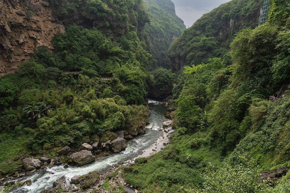 Der erste „Arbeitstag“ ist recht kurz, da wir uns an das Radfahren gewöhnen wollen und zudem ein Abstecher zur Maling River Gorge (马岭河峡谷) geplant ist. Die knapp 20 Kilometer bis zur Schlucht des Maling-Flusses sind eher langweilig, es geht mehrheitlich durch Xingyi und man ist in der Hauptsache damit beschäftigt, sich an den regellosen Verkehr anzupassen. Xingyi selbst hat nichts zu bieten, die alten Viertel der Stadt weichen, wie im Rest Chinas, den riesigen Gebäuden aus Beton, Stahl, weißen Kacheln und Glas, ein längerer Aufenthalt lohnt nicht. Anders sieht es in der Schlucht des Maling-Flusses (马岭河峡谷) aus, die im Nordosten von Xingyi liegt. Der Maling-Fluss hat über etwa 15 Kilometer eine tiefe Schlucht in die Karstberge gegraben, die besonders in der Regenzeit vom Sprühnebel der vielen Wasserfälle verschleiert ist. Üppige, subtropische Pflanzen bedecken die Flussufer, Schlingpflanzen hängen über tief ausgewaschene Höhlen. Hat man die CNY 80 Eintritt entrichtet, geht es in vielen Serpentinen hinab in die Schlucht, Wege auf beiden Seiten der Schlucht führen durch Tunnel und über miteinander verbundene Balkone und zu verschiedenen Aussichtspunkten. Kleine Hängebrücken kreuz und quer über den Fluss ermöglichen (früher) einen Wechsel der Perspektiven, heute sind viele dieser Brücken gesperrt. Insgesamt ist das Gebiet der Maling-Schlucht ein faszinierendes Erlebnis und wenn die Wasserfälle für uns im Frühjahr auch nur dahintröpfeln, so mutet die Klamm geheimnisvoll und mystisch an und hat ein wenig vom Jurassic Park.