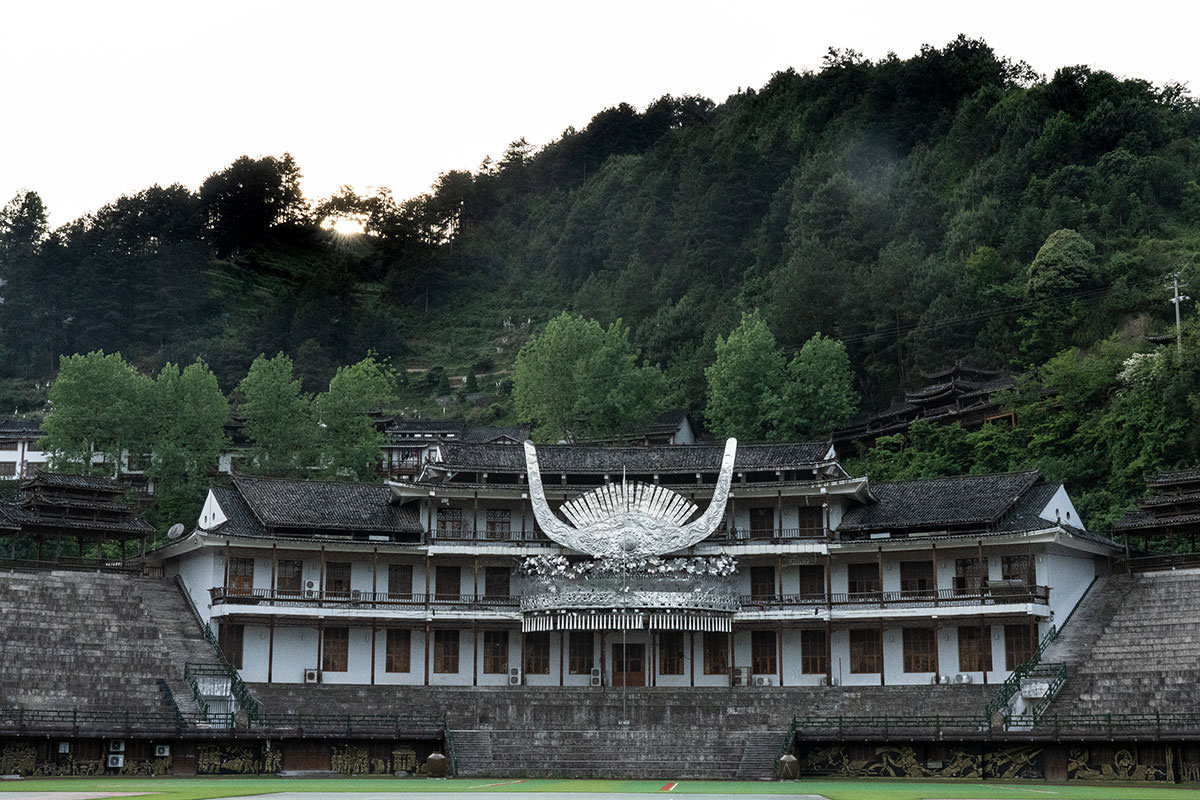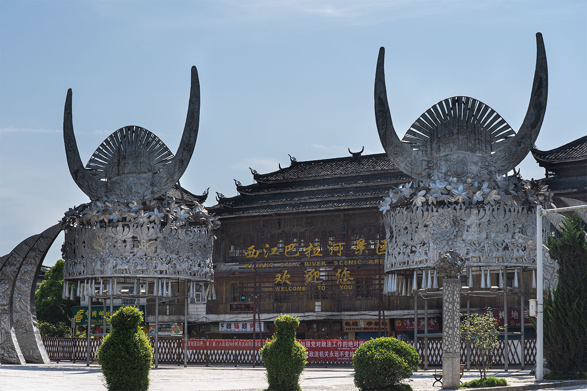 Als wir Xijiang erreichen, unsere Räder am Busbahnhof unterstellen und die Corona-Formalien erledigen, beginnt gerade die einmal am Tag stattfindende Empfangszeremonie, bei der mehrere Dutzend Miao-Frauen und Männer in traditionellen Kostümen und zum Klang der Bambusflöten und Zimbeln neue angekommene Gäste begrüßen. Das Spektakel mag ein wenig aufgesetzt wirken, ansehnlich ist es aber in jedem Fall, allein der filigrane Silber-Kopfschmuck der Miao ist schon eine Augenweide. Unser frühzeitiges Erscheinen hat darüber hinaus einen anderen positiven Nebeneffekt, das Dorf ist noch relativ arm an Touristen und demzufolge „ruhig“ (was sich ab dem frühen Mittag schlagartig ändern wird).