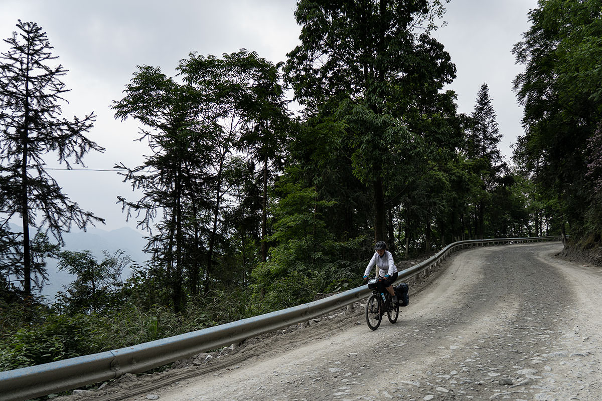 Die heutige Etappe wird unseren alten Knochen und unterentwickelten Muskeln alles abverlangen. Der Morgen in Xiashan begrüßt uns mit feinem, aber lang andauerndem Nieselregen, einer längeren Steigung und einer noch längeren Abfahrt auf nasser und seifiger Straße. In der kleinen Ortschaft Angu führt uns das Navigationsgerät direkt in den täglich stattfindenden Markt, die überdachten Buden sind wegen des Regens so dicht aneinander gebaut, dass wir mit dem Fahrrad nicht zwischen Hühnern, Bananen, Rindfleischkeulen und Reissäcken hindurchlavieren können. Auf der Umgehungsstraße geht es am Dorf vorbei und weitere acht Kilometer bergauf durch schöne, verregnete und vernebelte Berglandschaft. Bei der kleinen Ortschaft Yangchang lassen uns die digitalen Navigationshilfen noch einmal schmählich im Stich, unseren Apps zufolge stehen wir mitten in einem Feld… Die Auskunft eines Dorfbewohners hilft auch nicht weiter, er scheint unser Hochchinesisch nicht deuten zu können und wir sind mit seinem lokalen Dialekt gänzlich überfordert. Seine Gesten hingegen interpretieren wir dahingehend, dass wir zurück nach Angu fahren sollen und dort eine andere Straße zu nehmen hätten. Wir lassen uns also eine Zeitlang zurückrollen, bis uns auffällt, dass es in Angu gar keine andere Straße gab. Im selben Moment hält ein Fahrzeug der staatlichen Elektrizitätsgesellschaft auf unserer Höhe und der Mitarbeiter klärt uns auf, wir seien schon auf dem richtigen Weg gewesen. Also wieder zurück nach Yangchang. Der Dorfbewohner, dem man für seine Info vors Schienbein hätte treten können, hat sich natürlich aus dem Staub gemacht.