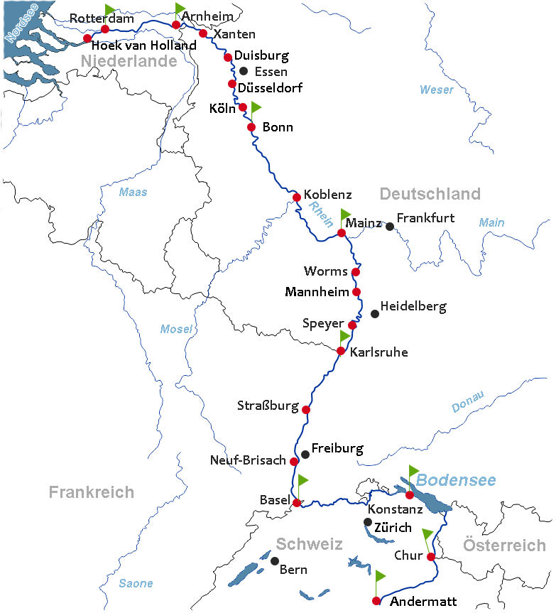 - Sonstiges: Die gesamte Tour lässt sich gut aufteilen, etwa in einen schweizerischen Teil (mit der Möglichkeit von Wanderungen in den Bergen), eine Niederrheintour (Köln bis Arnheim) mit sehr flachem Terrain oder eine Kult-Tour im Elsass (Straßburg nach Mainz) usw. Schön und „romantisch“ wird es am Mittelrhein zwischen Bingen und Koblenz mit zahllosen Burgen und mittelalterlichen Städtchen am Rheinufer.