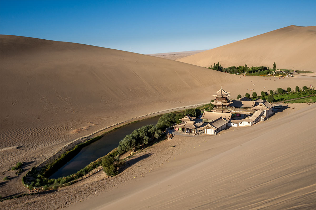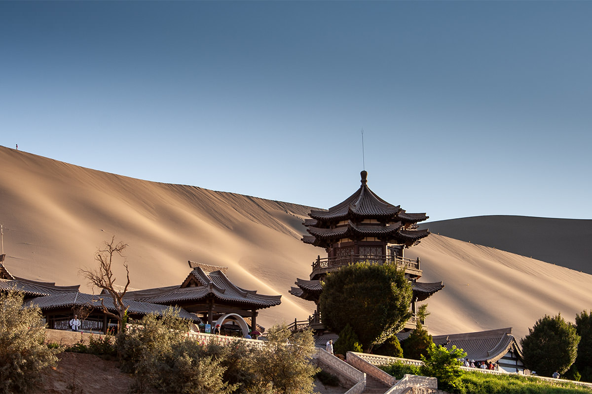 Mogao-Grottendie Mogao-Grotte zum Weltkulturerbe der UNESCO aufgenommen. - Mondsichelsee: Im nördlichen Teil der Mingsha-Berge liegt ein mondsichelförmiger See (Cresent Lake, 月牙泉; Pinyin: Yuèyá Quán) nebst einem Tempel aus der Han-Zeit. Natürliches Wunder: der See wird vom umherwehenden Sand verschont.