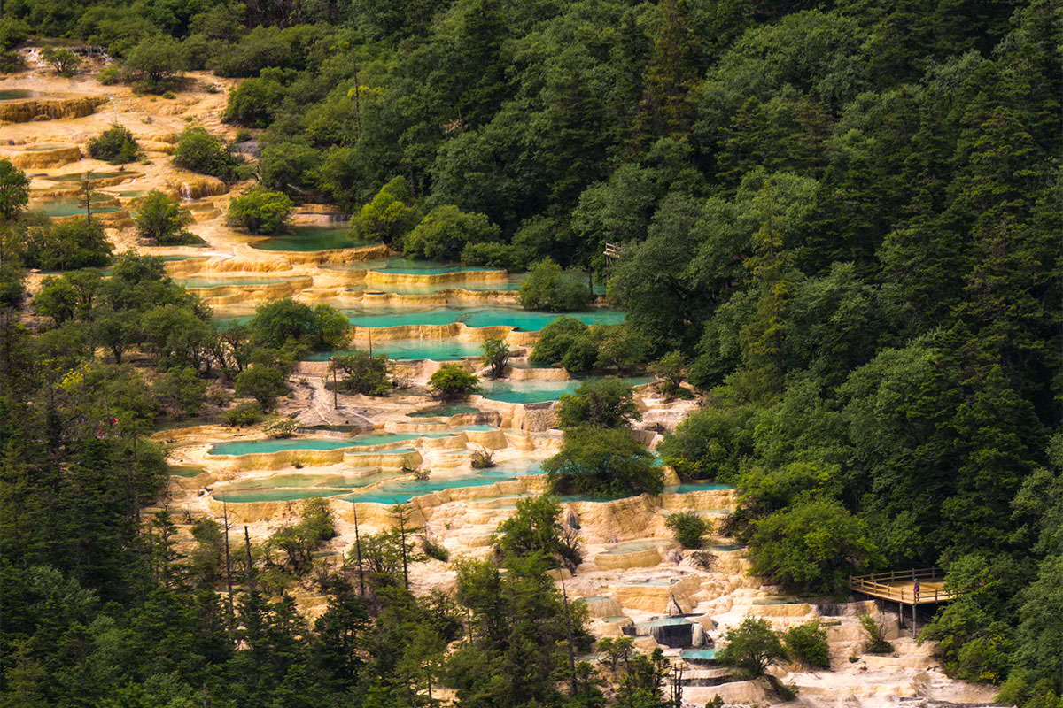 Unweit der Wald- und Seenlandschaft von Jiuzhaigou liegt ein weiteres UNESCO-Welterbe-Highlight Sichuans, die Sinterterrassen von Huanglong. Oft wundert man sich über die blumige Namensgebung der Chinesen für Steine, Wolken o.Ä., der Name Huanglong (= Gelber Drache) ist allerdings trefflich gewählt: Von den östlichsten Gletschern Chinas in der Minshan-Bergkette am Berg Xuebao windet sich ein etwa vier Kilometer langes Band aus kleinen und großen Sinterterrassen, die wegen ihres starken Kalziumkarbonat-Gehaltes gelblich erscheinen, ins Tal hinab. Die Teiche schimmern in den Farben Türkis und Blau, aus einiger Entfernung wirken die Becken tatsächlich wie die Schuppen eines Drachen, der sich an den Berghängen ausruht. Ein Meisterwerk der Natur!